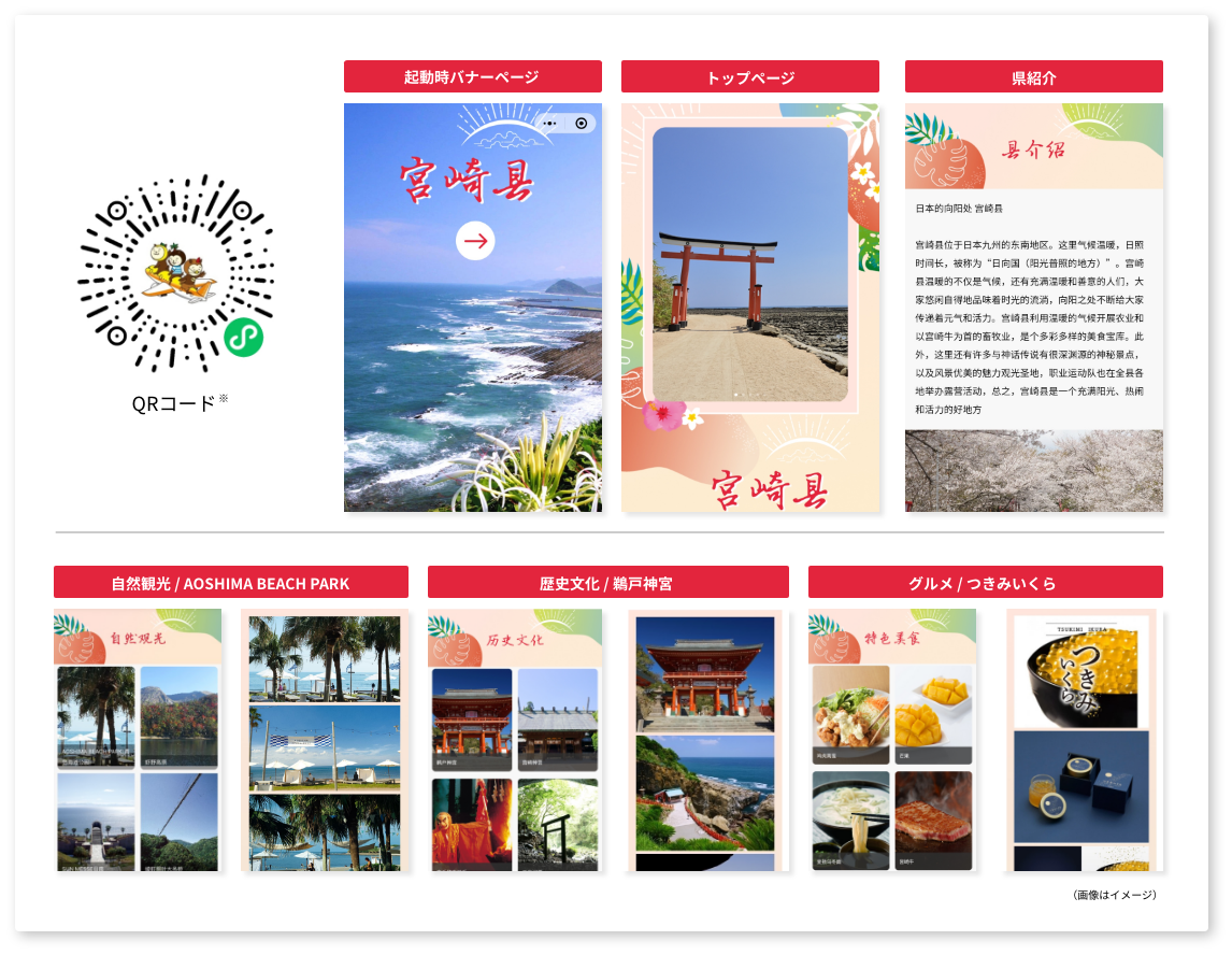 約13億人が日々の生活で利用している中国最大のSNS「WeChat(ウィーチャット)」内に、自然観光(AOSHIMA BEACH PARK・えびの高原・サンメッセ日南など)や歴史文化(鵜戸神宮・宮崎神宮・高千穂夜神楽など)、グルメ(チキン南蛮・釜揚げうどん・つきみいくらなど)のさまざまな情報を、南国宮崎をイメージした明るいデザインとともに、宮崎県の魅力をWeChat(ウィーチャット)ユーザーに対してよりわかりやすく発信いたします。