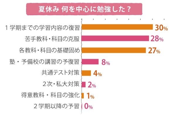 夏休みは志望校の過去問に挑戦、と思う人もいるかもしれませんが、ちょっと待って! その前に「基礎固めができているか」「苦手科目がないか」を確認しましょう。先輩のアンケートでも、夏に取り組んだことの上位は、今までの復習や苦手科目の克服、基礎固めとなっています。