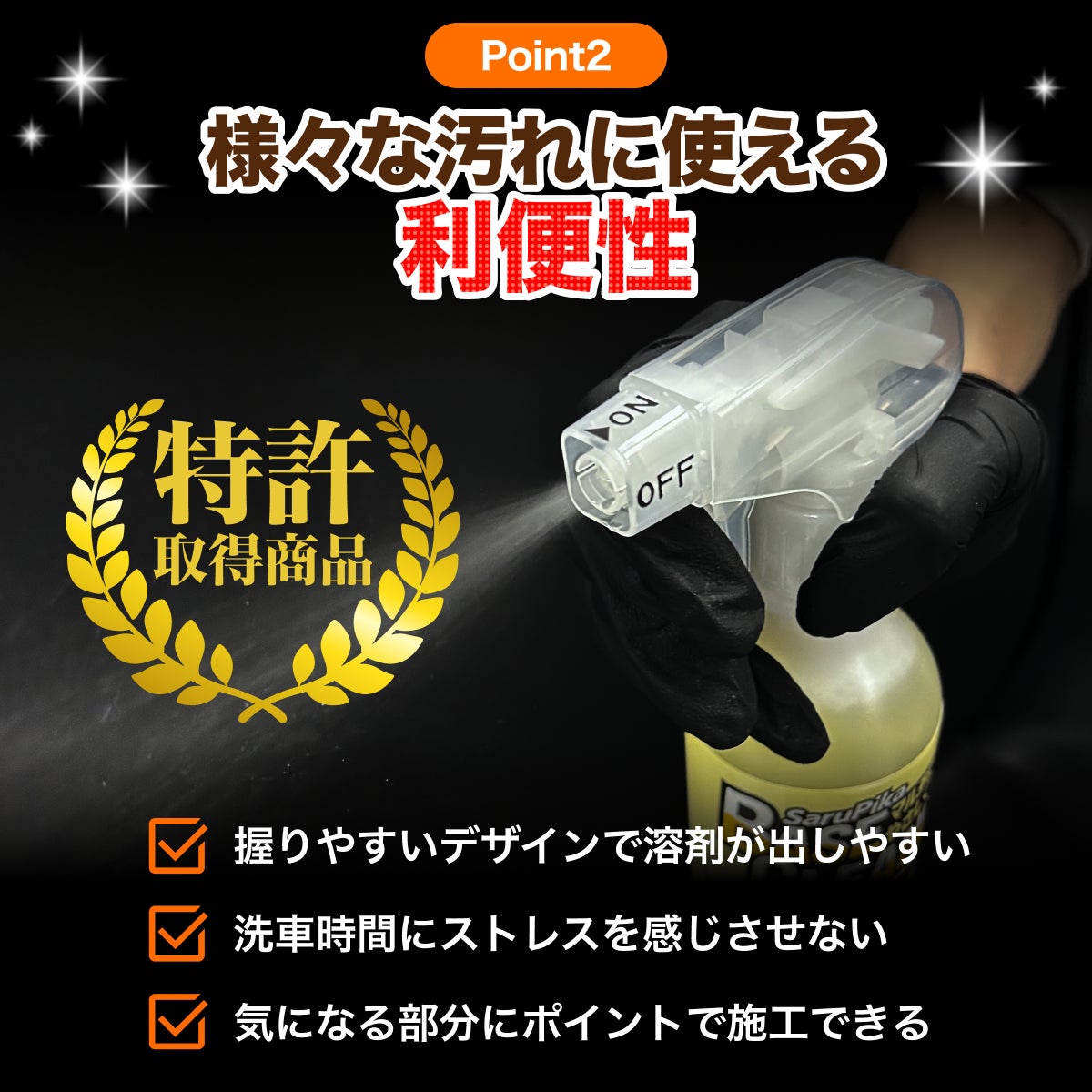 ボトルには、特許取得商品のスプレーボトルを採用しています。握りやすいデザインで、溶剤を出しやすいのが特長です。