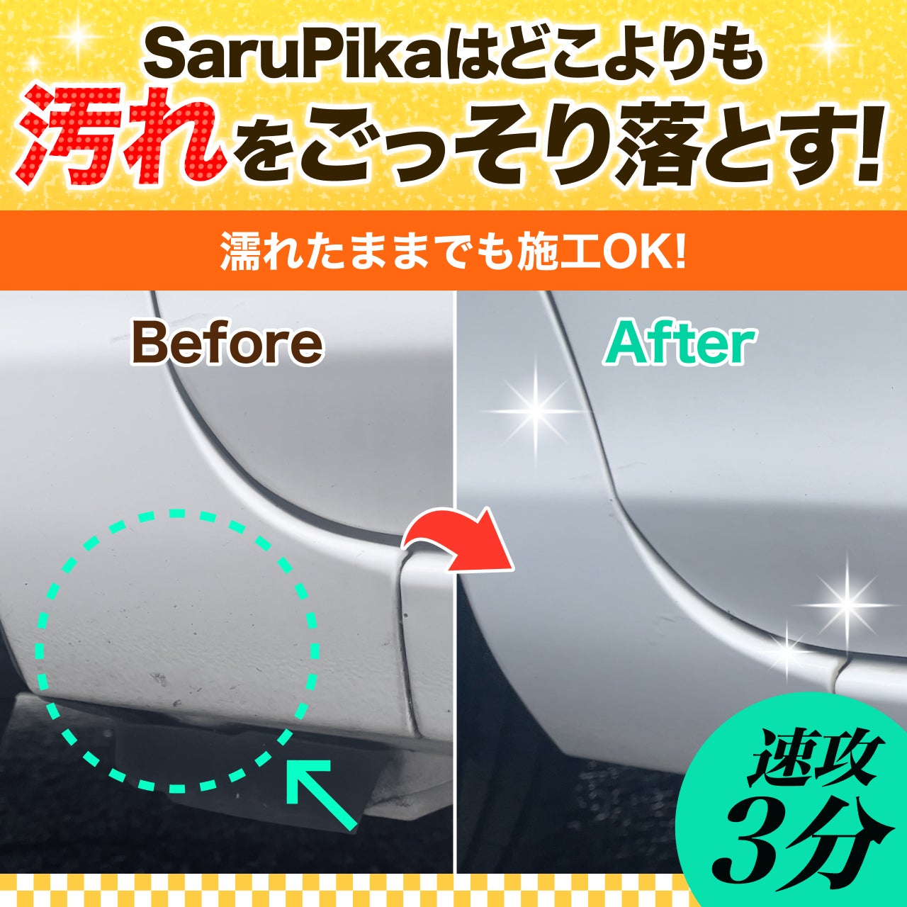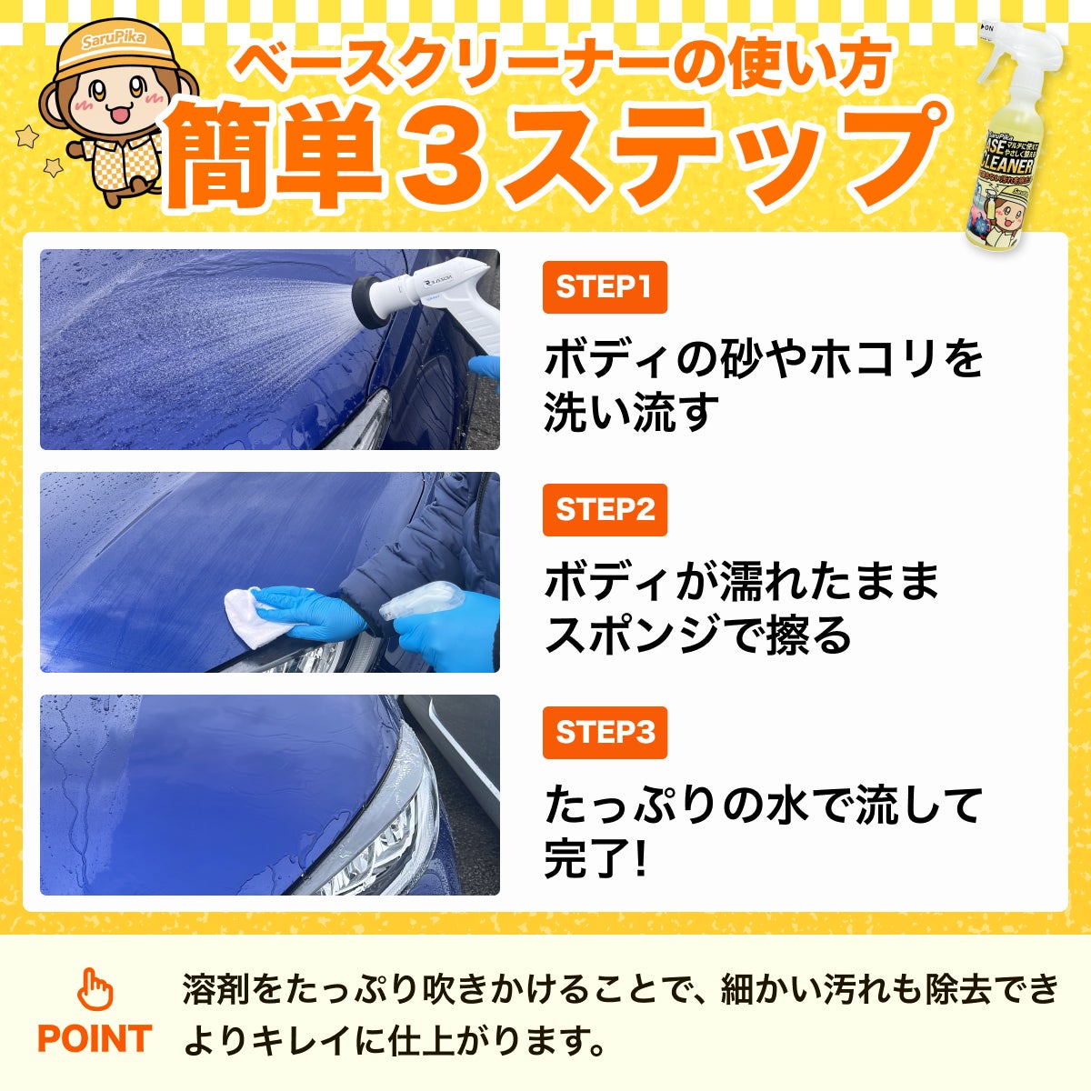 Sarupika「ベースクリーナー」は、洗浄力だけでなく、毎日のカーケアに取り入れやすい使いやすさにもこだわった商品です。難しい手順や特別な準備は不要で、誰でも簡単に施工できます。