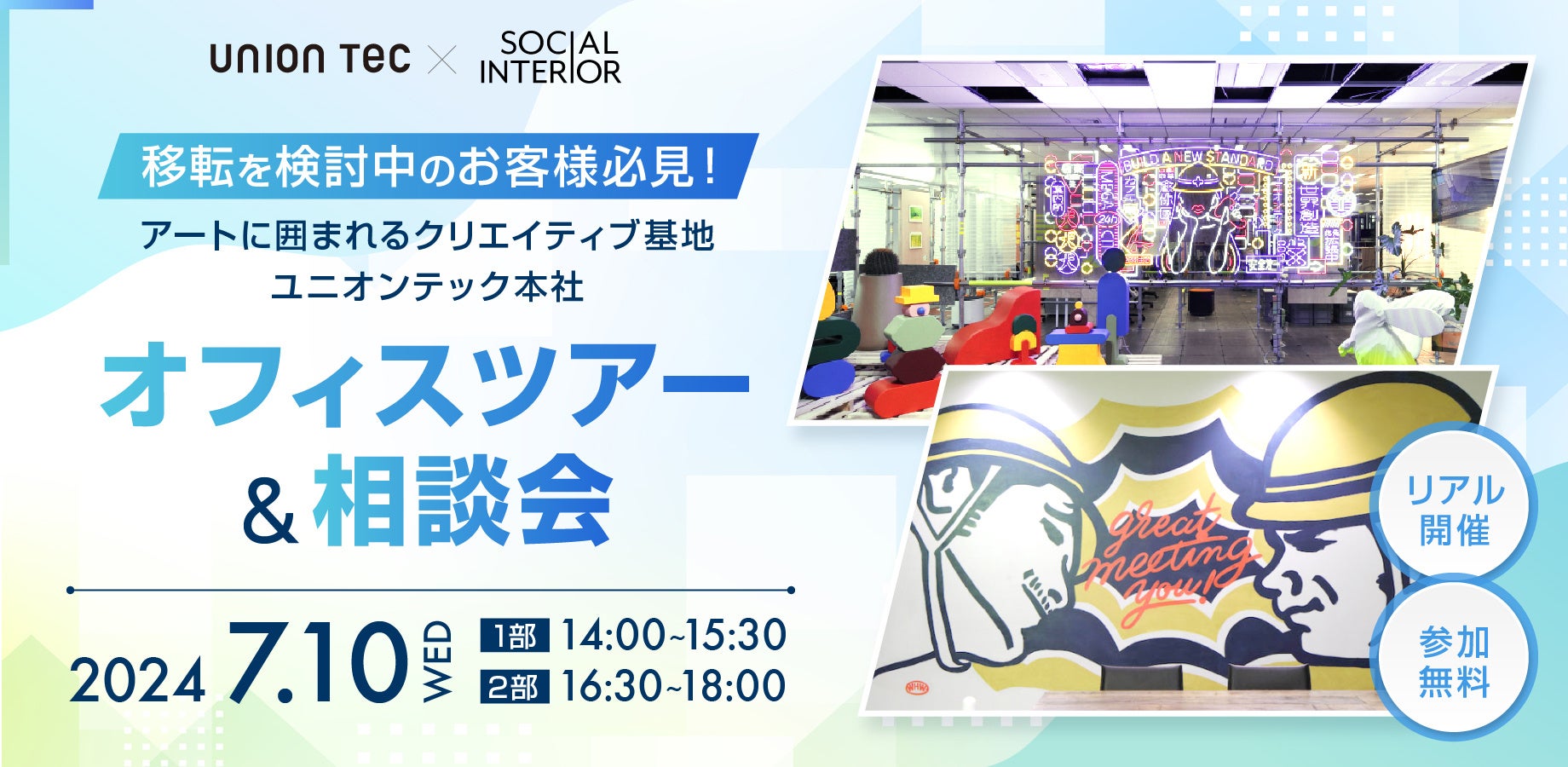 「Build a new standard.」をミッションに、オフィス・店舗の内装デザイン・設計・施工をワンストップで提供するユニオンテック株式会社(東京都渋谷区、代表取締役社長:大川祐介)は、株式会社ソーシャルインテリア(東京都港区、代表取締役:町野 健)との共催で、ユニオンテック東京本社のオフィスツアーを開催いたします。