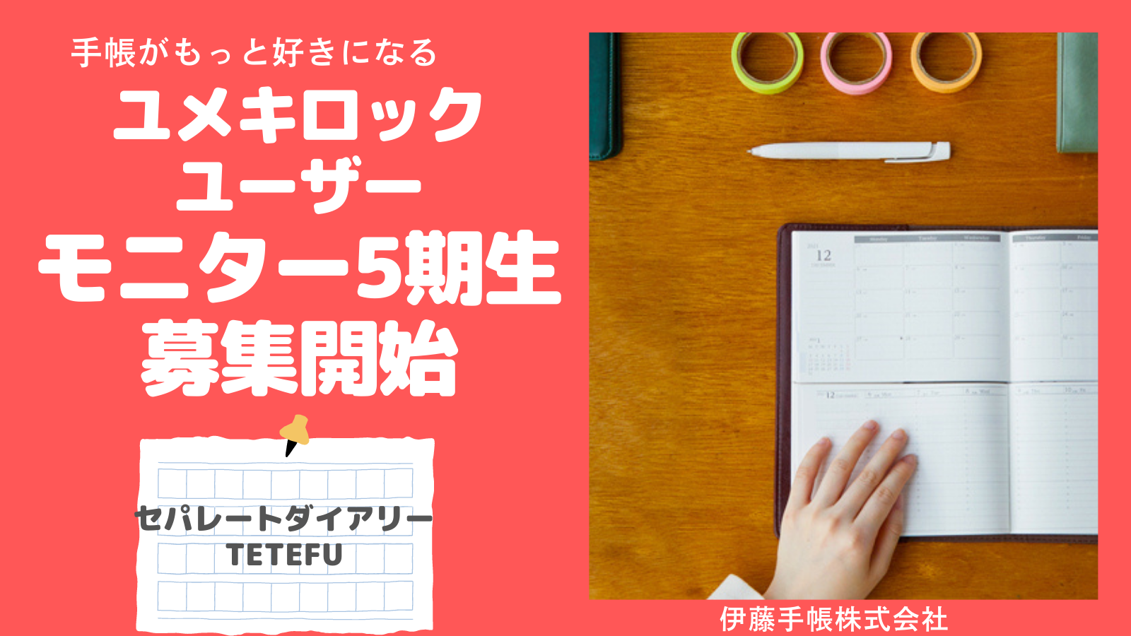 手帳製造・OEMを手がけて68年の伊藤手帳株式会社(本社名古屋市東区 代表取締役社長:伊藤 亮仁 以下当社)は自社ブランド「ユメキロック」の手帳を使用しているユーザーを対象に2月25日(金)よりモニターを募集します。ユーザーモニターは発売以来のべ約100,000冊販売した上下2段にわかれる手帳「セパレートダイアリー」と小さく折りたためる手帳「TETEFU」の利用者を対象とし、今年で5期目の開催となります。
