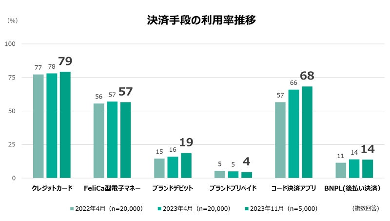 図3:決済手段の利用率推移(2022年4月<n=20,000>,2023年4月<n=20,000>,2023年12月<n=5,000>,複数回答)
