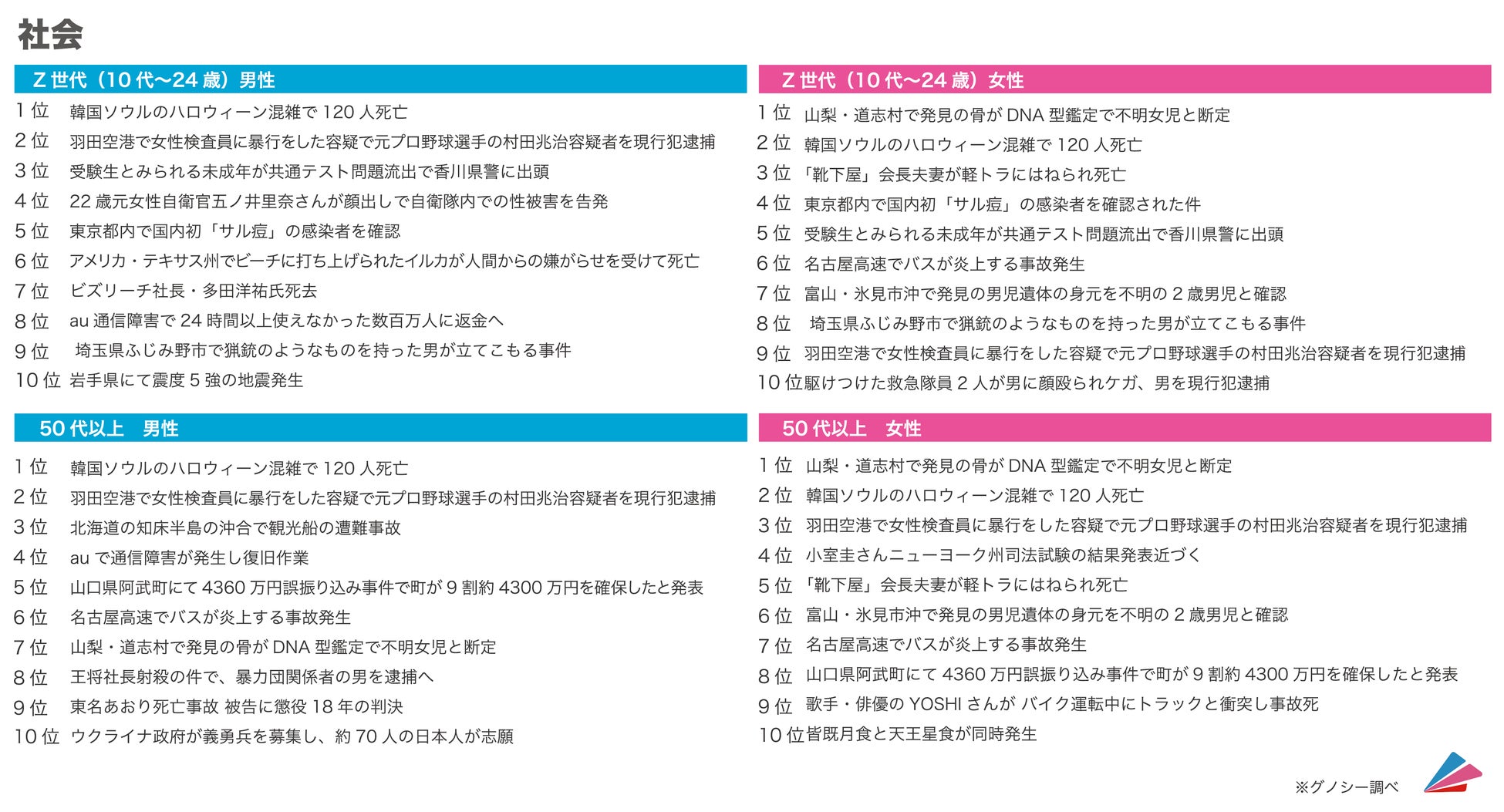 グノシーでは毎⽇多くのニュースを配信しており、独⾃のアルゴリズムに基づくパーソナライズ機能により⼀⼈ひとりに最適なニュースを掲出しております。この度新たな取り組みとして「2022年のニュースランキング」について、通常のサービス上では⽬にすることがない世代及び性別ごとに調査し発表いたします。