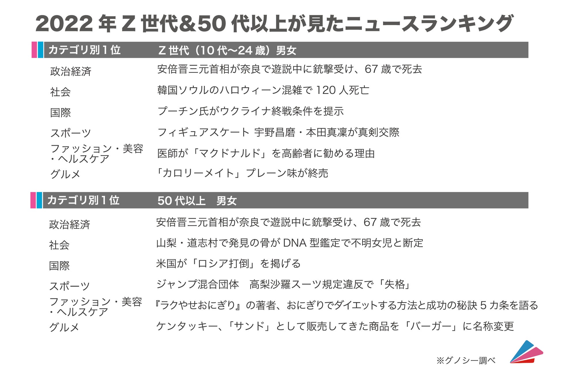 株式会社Gunosy(本社:東京都渋⾕区、代表取締役社⻑:⽵⾕祐哉、以下 Gunosy)は、情報キュレーションサービス「グノシー」内の2022年における掲載記事を対象に調査を実施し、「Z世代&50代以上が⾒た2022年のニュースランキングに関する調査」を発表いたします。