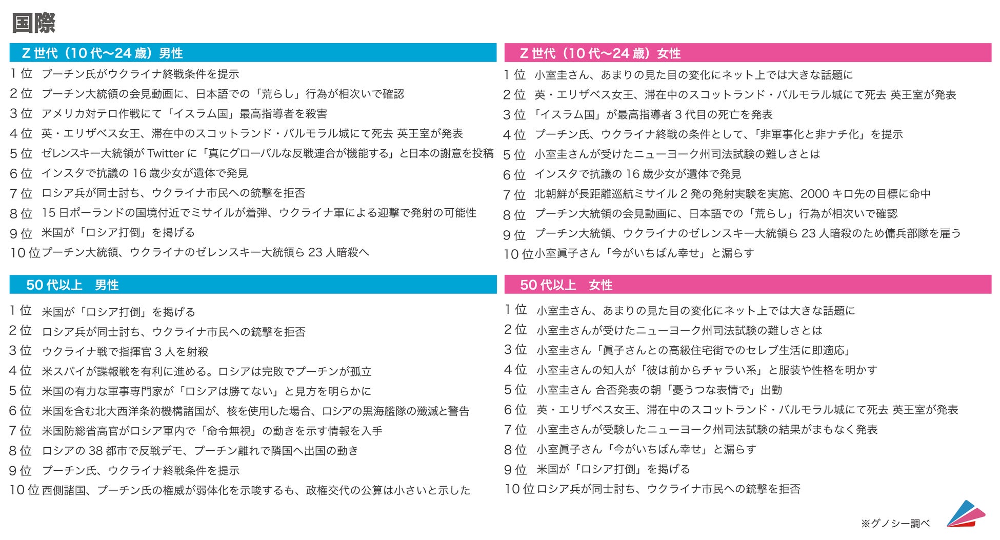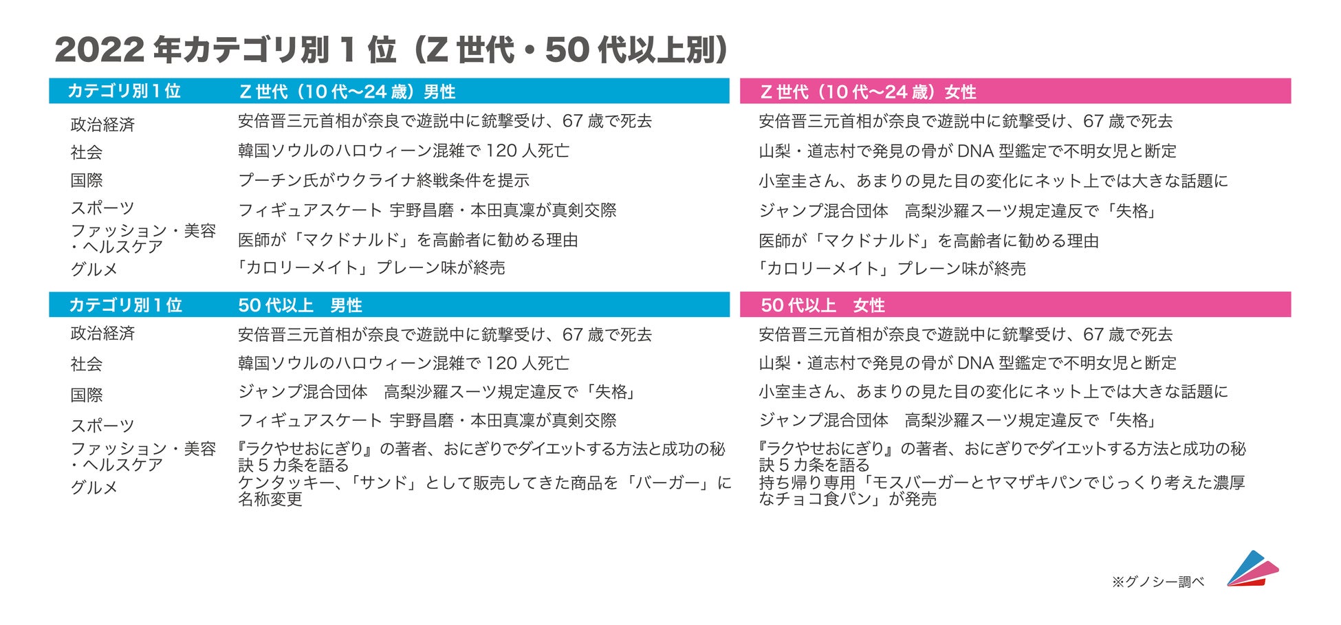 今回は2022年の年納めとして、クリック数ランキングをお伝えしました。社会で⼤きな話題となった安倍元⾸相の襲撃関連や、眞⼦さまと⼩室圭さんご結婚に関係するニュースは、どの世代・年齢でも共通して多く読まれていました。⼀⽅でZ世代では韓国ソウルの転倒事故が注⽬され、50代以上では皇室関連や⼭梨県道志村で発⾒された遺⾻のニュースが注⽬されるなど、グノシー利⽤者の年齢層によって興味関⼼の傾向に違いも⾒て取れる結果となりました。 今後もグノシーでは継続的にアルゴリズム改善を⾏い、世代や性別間の違いも考慮した独⾃のパーソナライズ機能を通して、分かりやすく的確な情報を皆様にお届けして参ります。