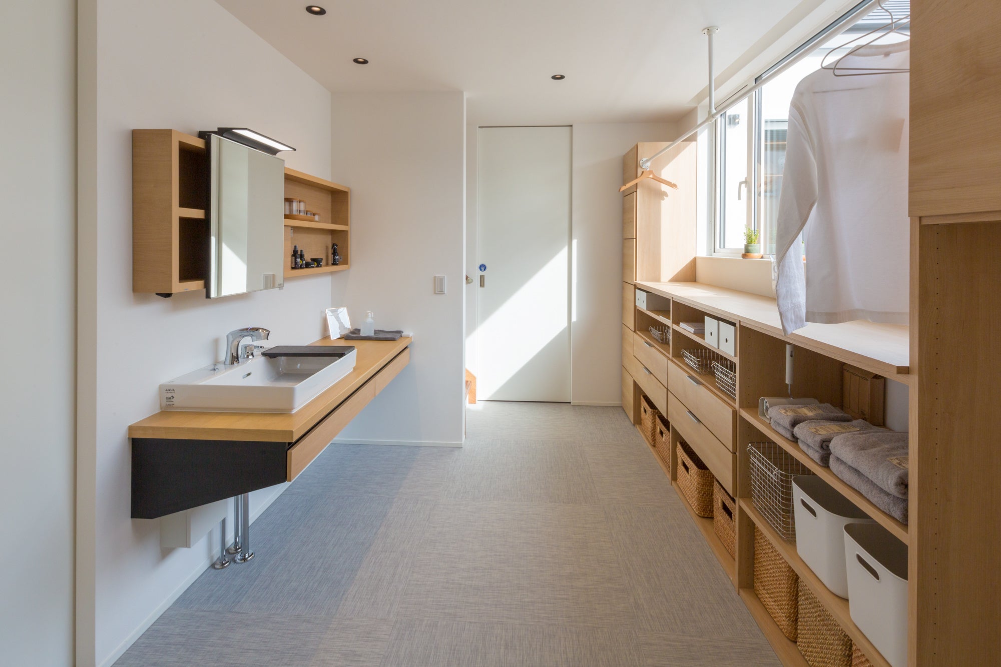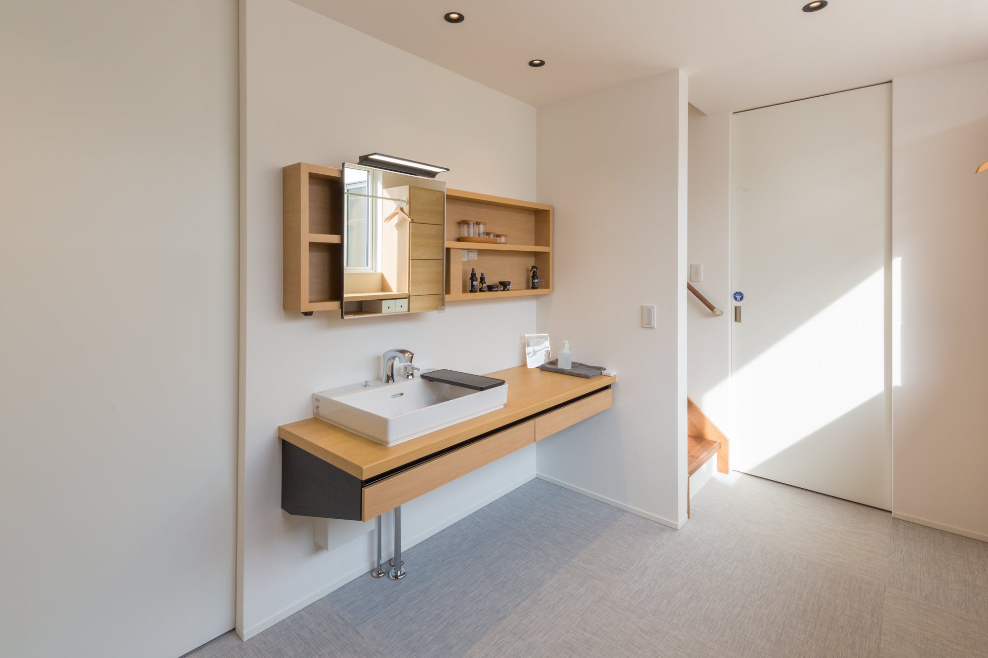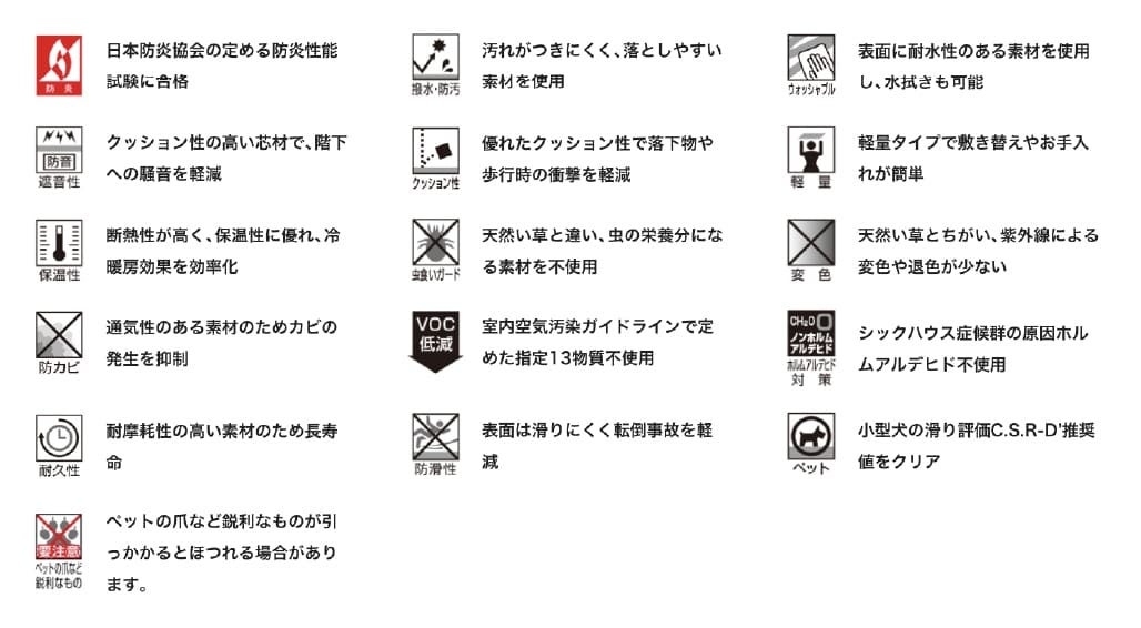 リフェイスタイルの表面は耐水仕様となっており、水を弾くのでキッチンやお風呂場でもご使用頂けます。濡れた素足でも滑りにくい表面材で、衝撃吸収性を備え、さらに防炎認定も取得しているため幅広いシーンで活躍します。洗面所やキッチンなど水まわりにはもちろん、ホテルや旅館の宴会場、脱衣場、飲食店、介護施設、保育園、ペット共生環境にもおすすめです。
