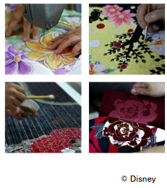様々な匠(職人)が伝統技法や熟練の手加工で、特別なディズニーデザイン振袖を制作。ハレの日にふさわしい上質な振袖をきていただきたいという思いが、随所に込められています。