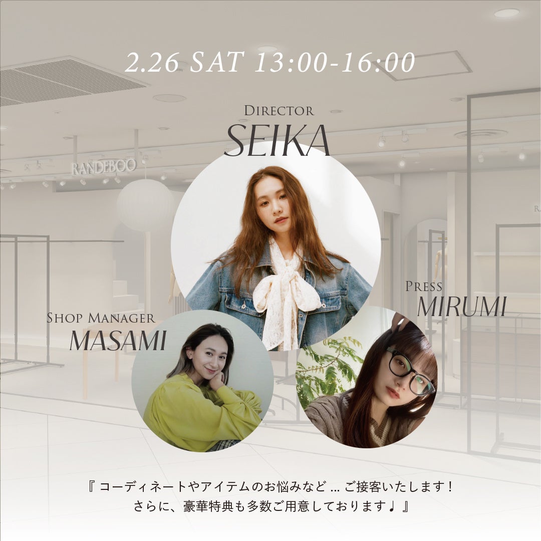 また期間中の2月26日(土)の13:00〜16:00にはRANDEBOOディレクターSEIKA、RANDEBOOプレスMIRUMI、ショップマネージャーMASAMIが来店イベントを行い、お客様へ接客をさせていただきます。
