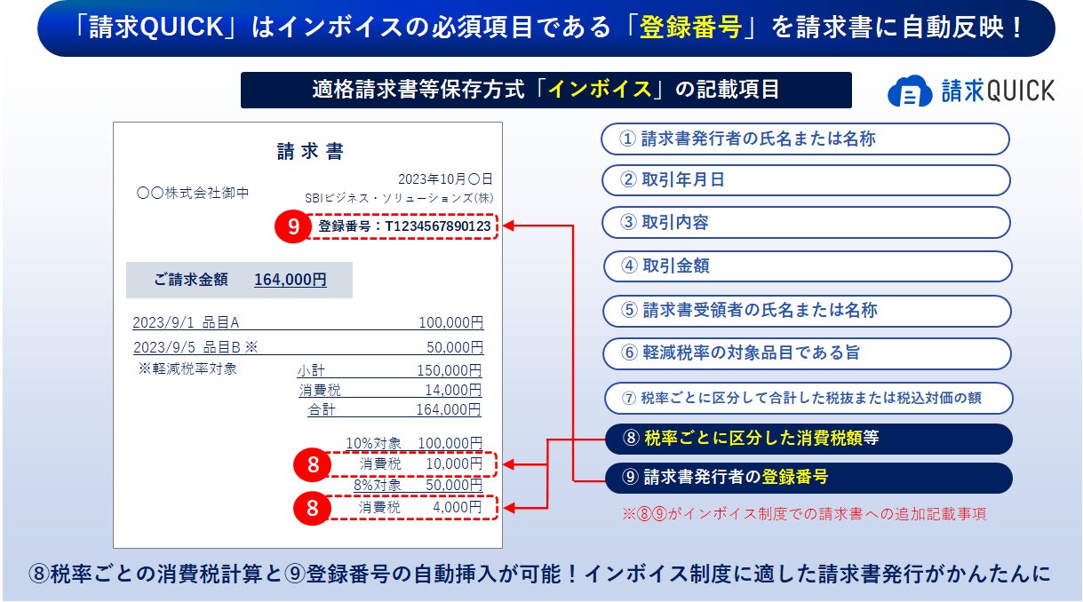 総合フィンテックソリューション企業であるSBI FinTech Solutions株式会社の子会社で、バックオフィス支援サービスを提供するSBIビジネス・ソリューションズ株式会社(本社:東京都港区、代表取締役社長:夏川 雅貴、以下「当社」)は、クラウド型請求書発行システム「請求QUICK」において、インボイス制度における請求書の記載必須項目である適格請求書発行事業者の“登録番号”を自動で挿入可能な機能を搭載しましたので、お知らせいたします。