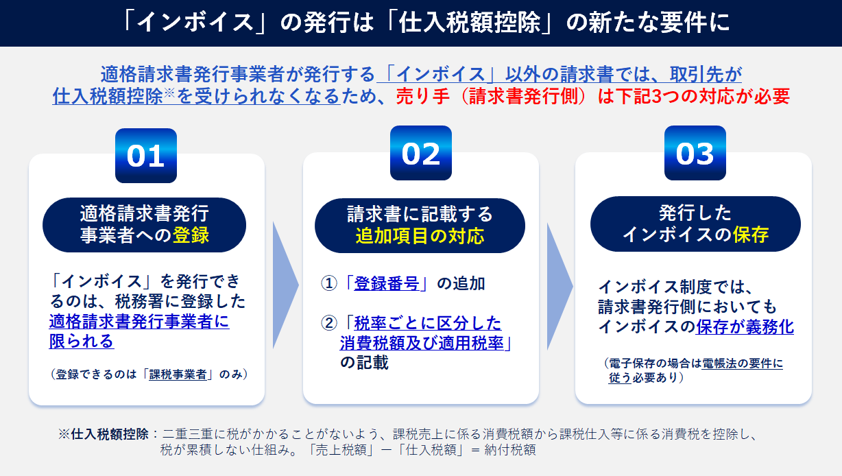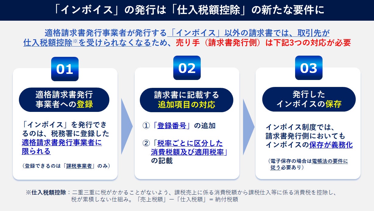 買い手である取引先が仕入税額控除を適切に受けられるようにするためには、売り手の請求書発行側は大きく3つの事項に対応することとされています。1つ目は、登録を受けた課税事業者以外は「適格請求書」であるインボイスを発行することができないことから、まずは「適格請求書発行事業者」としての登録をすること。2つ目は、「登録番号」および「税率ごとに区分した消費税額」など、インボイス制度において新たに追加になった項目を請求書に記載し、要件を満たした形で請求書を発行すること。3つ目は、インボイス制度開始後は、請求書の発行側においても発行したインボイスの控えの保存が義務付けられるので、電子保存をする場合は改正電子帳簿保存法に則った形で保存することです。