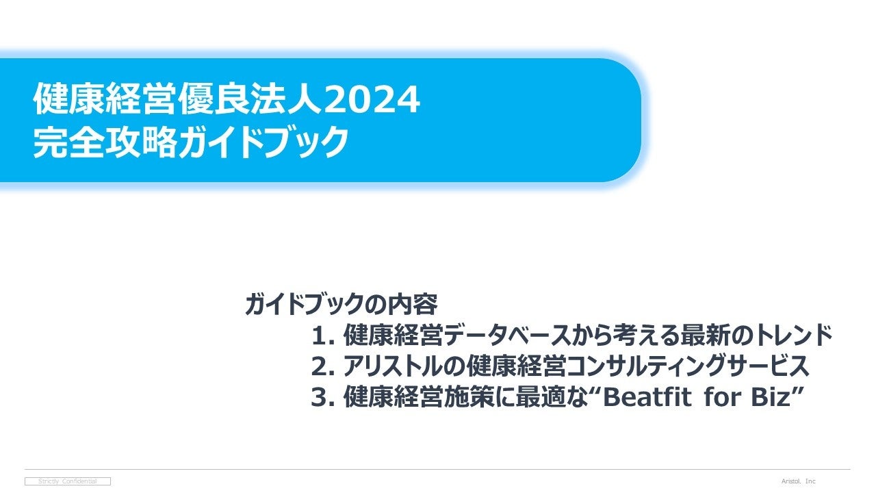 当社としては、より一社でも多くの企業様が健康経営に携わってほしいとの思いから、昨年に引き続き、参考ウェブサイトに掲載されている公開情報を基に、独自の視点で傾向と対策をまとめ、「健康経営優良法人2024 完全攻略ガイドブック」としてリリースいたしました。
