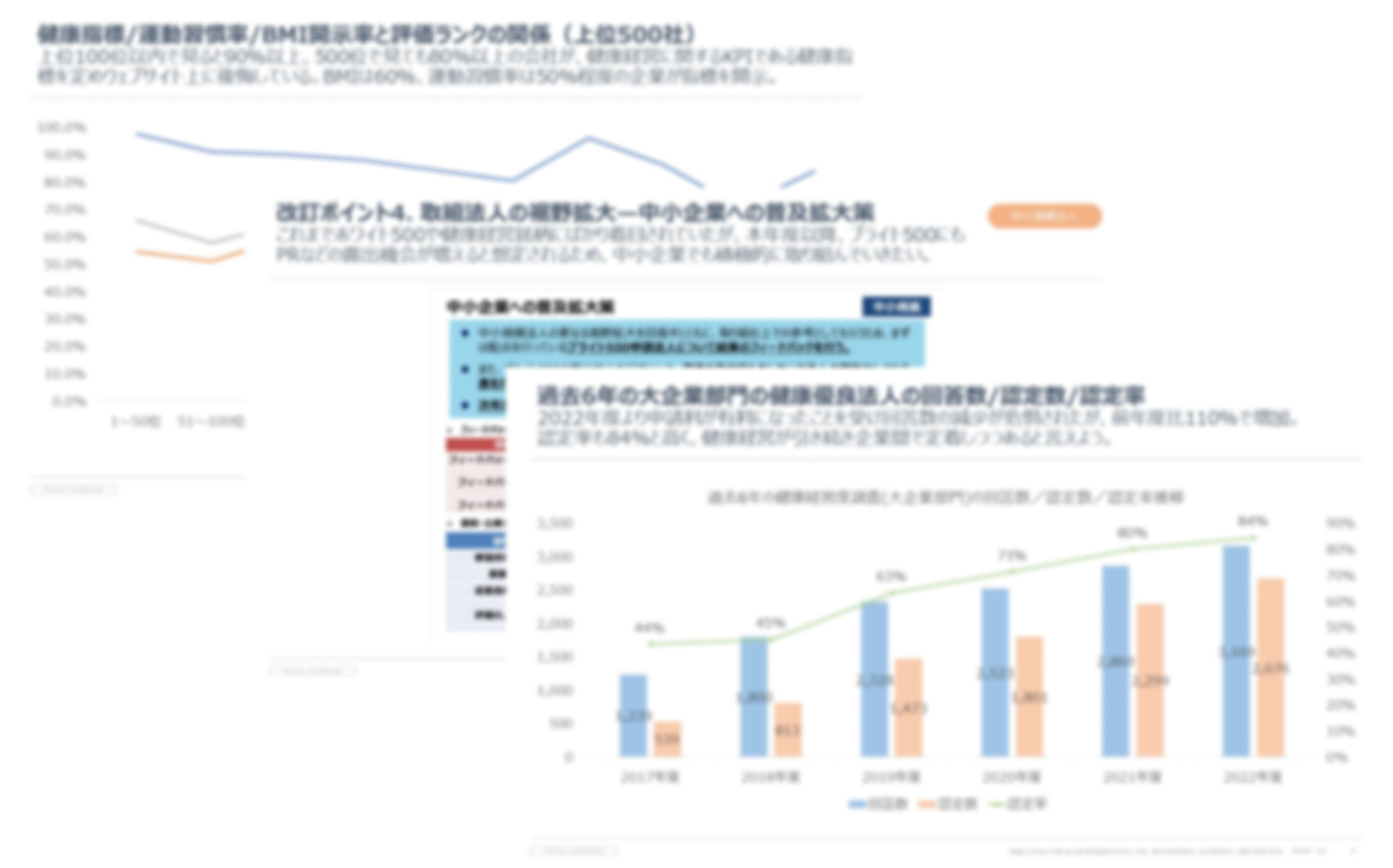 健康経営優良法人の特に上位資格を狙いたい企業様に、何に取り組めば差別化しやすいか(評点が上がりやすいか)、全体的な傾向を踏まえ言及していますので、「一歩先を行きたい」企業様はぜひご活用ください。