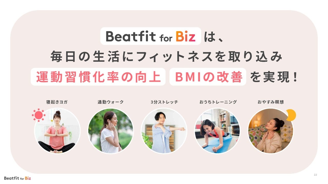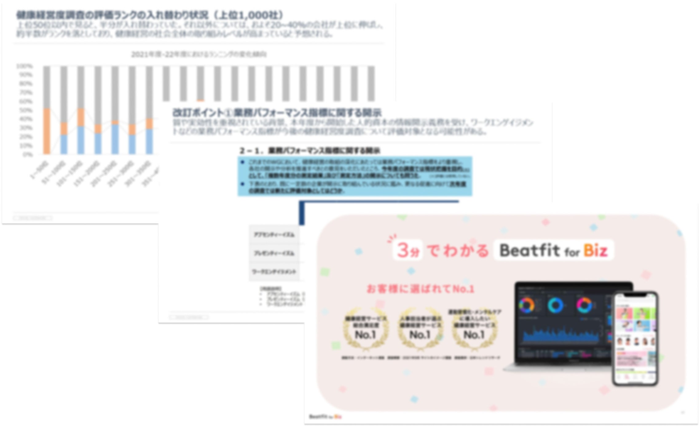当社では、これまで数多くの企業様に、従業員の運動習慣率向上、BMI改善を通して企業の健康経営を実現するシステム「Beatfit for Biz」を導入して頂き、導入企業様は健康経営優良法人の認定資格はもちろん、健康経営銘柄、およびホワイト500の上位資格を取得されてきました。こうした企業様と対話を続けていく中で、それら資格認定のための健康経営度調査も年々アップデートがなされる中「上位資格も維持しつつ、本質的に意義のある健康経営施策を実施したい」という声を頂くことが多くなりました。