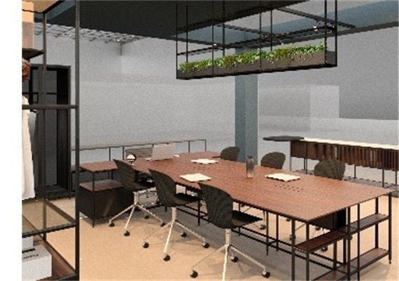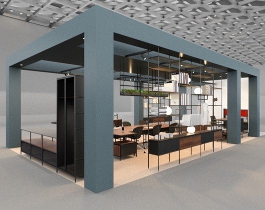 ブース内は一人用デスクをメインとしたプライベートゾーンとミーティングテーブルを中心としたパブリックゾーンがあり、シェルフによってそれぞれの空間が構成されています。シェルフには収納やディスプレイの機能だけでなく、キッチンカウンターとして利用できるシェルフやベンチを組み込んだシェルフなど、様々な仕掛けを施しています。Teseraの特徴である空間に合わせて自在に形を変えることができる魅力もご体感いただけます。
