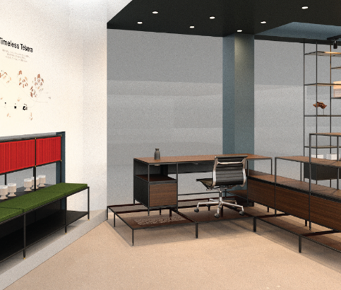 オルガテック東京2024のコンセプトは昨年から引き続き“SHIFT DESIGN”。展示会のテーマでもある働く環境においてのオンとオフの調和を目指し、Teseraの特徴を活かした様々な形状のシェルフを用いて、用途が異なる空間を豊かに演出しながら緩やかにゾーニングするインテリアプランを提案します。