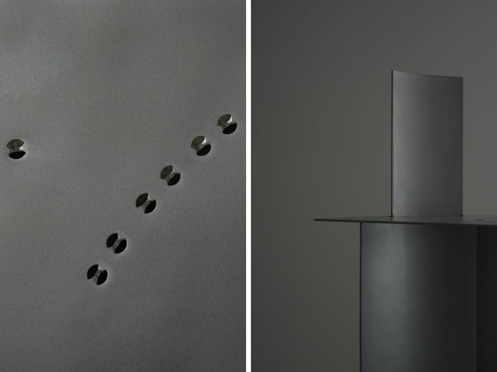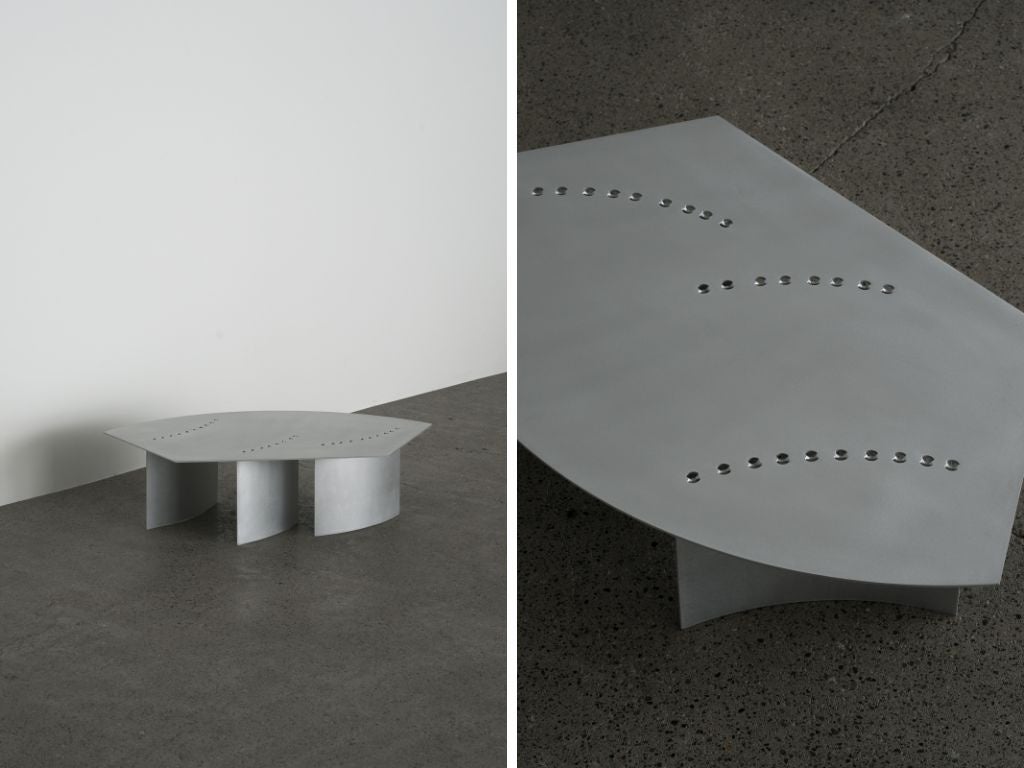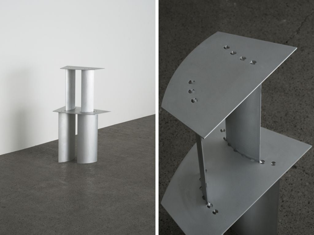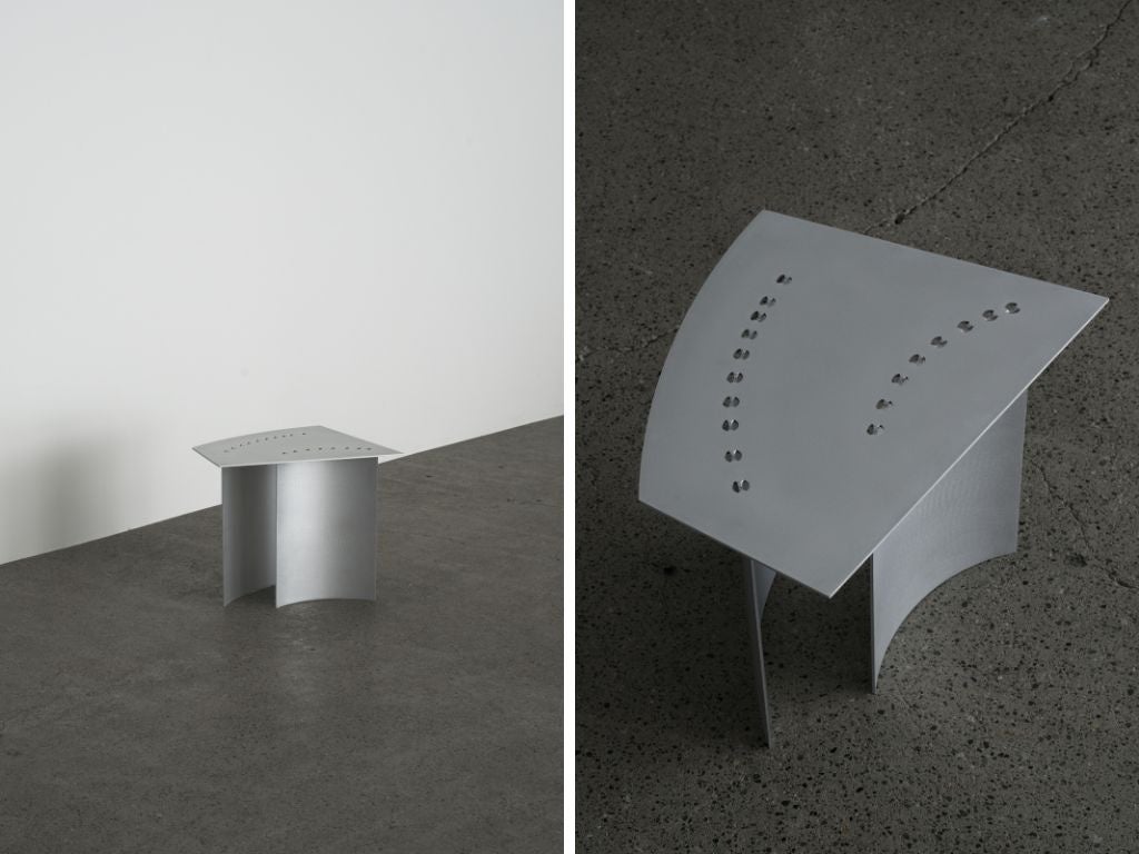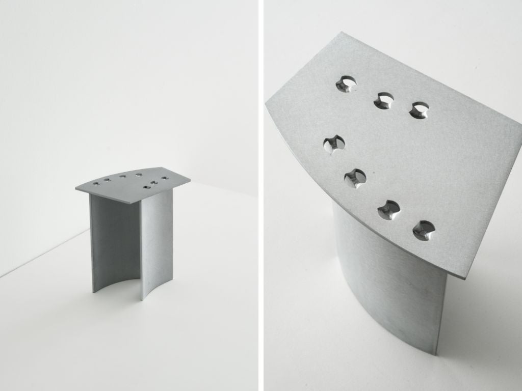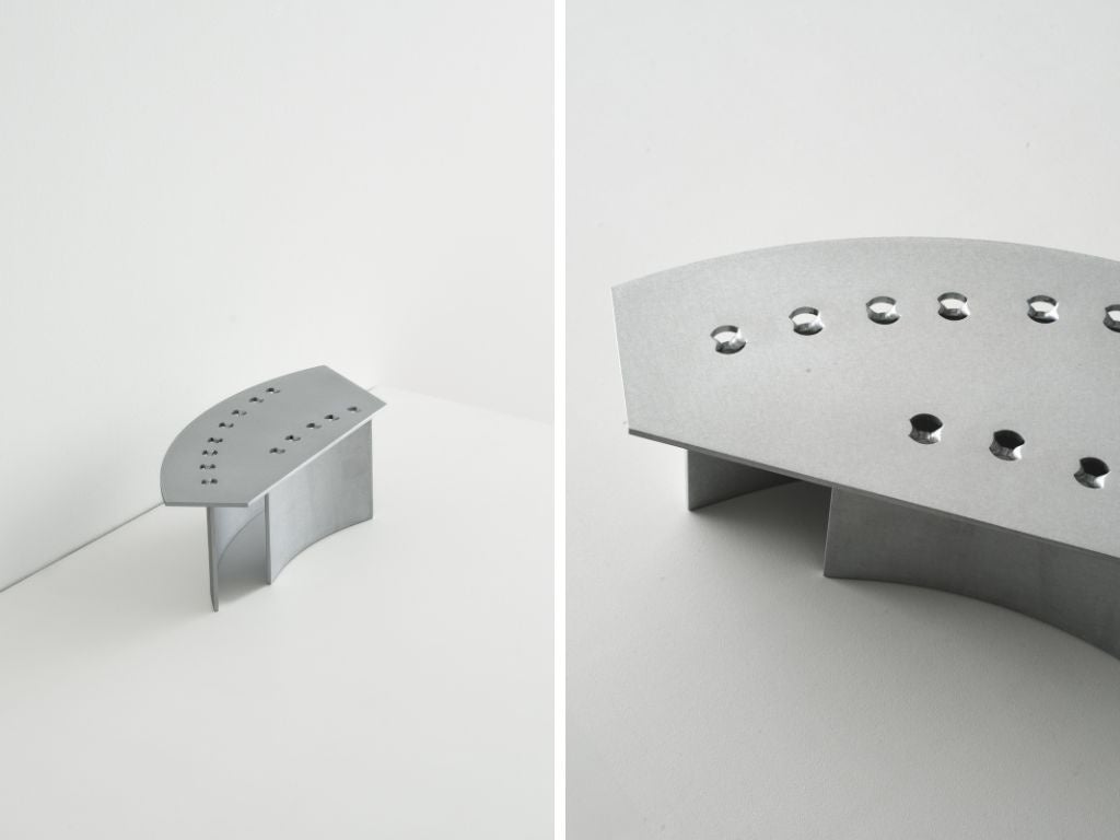 「Klon Klon(クロン クロン)」は、レーザーカットや曲げ、溶接といった板金加工の痕跡を意図的に残し、それらをデザインに組み込むことで製造のプロセスを可視化するアルミの家具コレクションです。