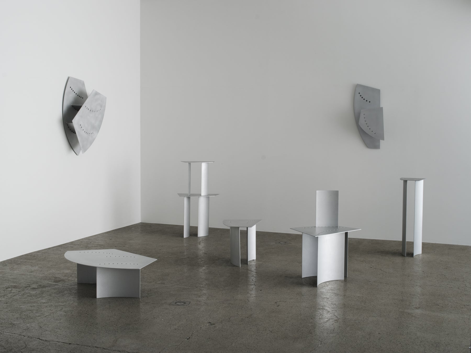 厚さ4mmのアルミ板をレーザーカットした面材で構成されており、平面と円弧に曲げたものの2種類を用いています。レーザーカット断面には加工時の痕跡をそのまま残しています。平面のアルミ板には曲面のアルミ板に沿うように丸穴を設け、2種類のアルミ板は丸穴を介して溶接しています。これにより通常は見えなくなる溶接の痕跡が、穿たれた丸穴とともに浮かび上がります。