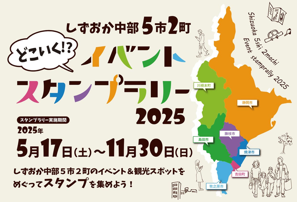 静岡県中部の観光地域づくりに取り組む公益財団法人するが企画観光局(静岡県静岡市)は、2025年5月17日(土)からしずおか中部5市2町「どこいく!?イベントスタンプラリー2025」を開催します。