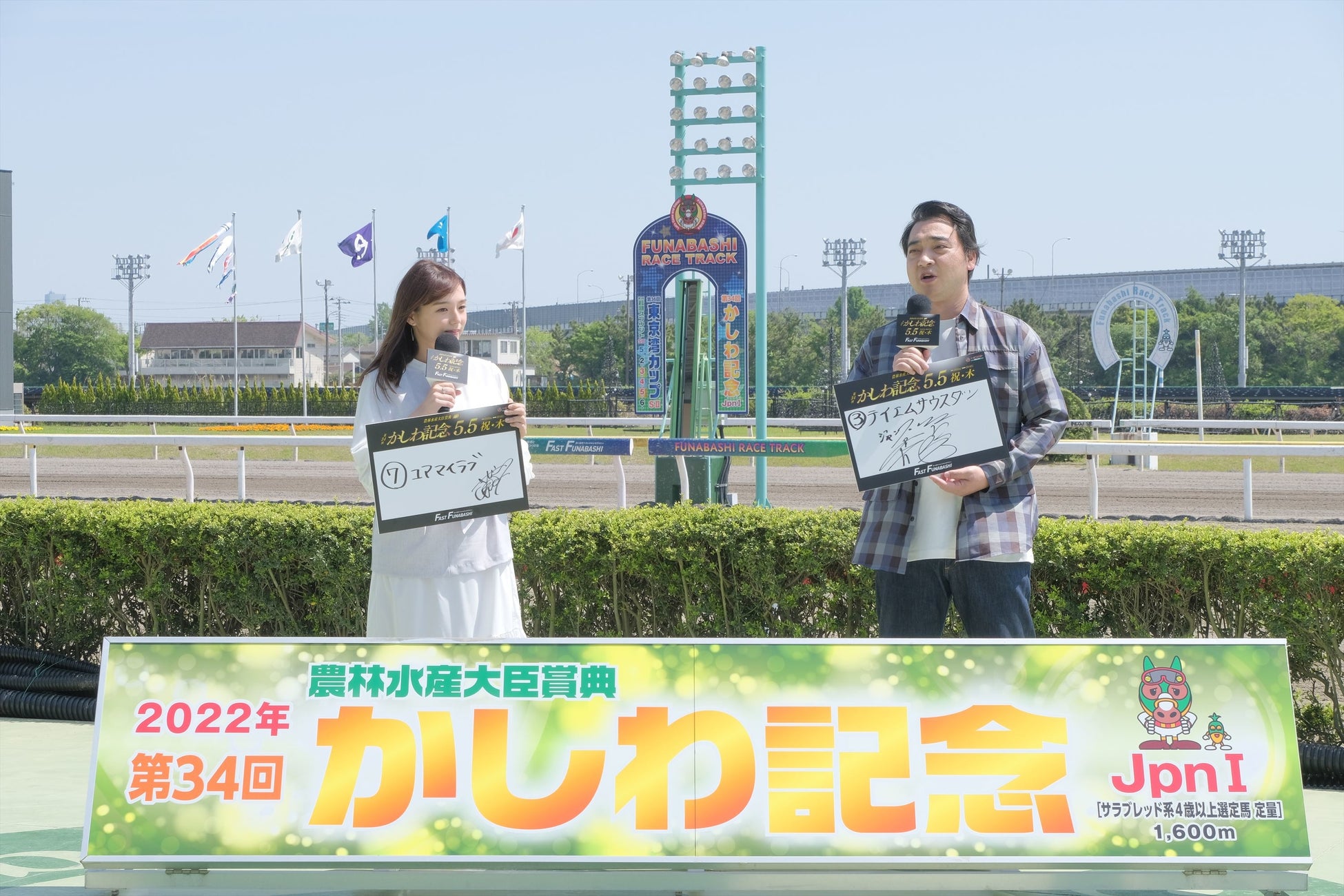 明日5月5日(祝・木)に『農林水産大臣賞典 第34回 かしわ記念 JpnⅠ』を開催する船橋ケイバ。船橋競馬最大であるレースの応援にお笑いトリオ芸人ジャングルポケットより斉藤慎二さんと、タレントの篠崎愛さんが駆け付けました。船橋競馬のある千葉県出身の斉藤さんは「中学生のころ親戚がテレビで競馬を見ていて興味を持ち、父に連れてきてもらった初めての競馬場船橋競馬場で、そこから馬が好きになりました。いつもはスタンドから見ているだけだったので、こうやってお仕事としてトークしているのが夢のようです。大体300回は来ました。」と喜びのコメント。また、篠崎愛さんからは「リニューアルが進んでいて更にきれいになった印象。食べるのが大好きなので、出店やキッチンカーがあるのはとてもうれしいですね!」と船橋競馬場に訪れた感想を語っていただきました。