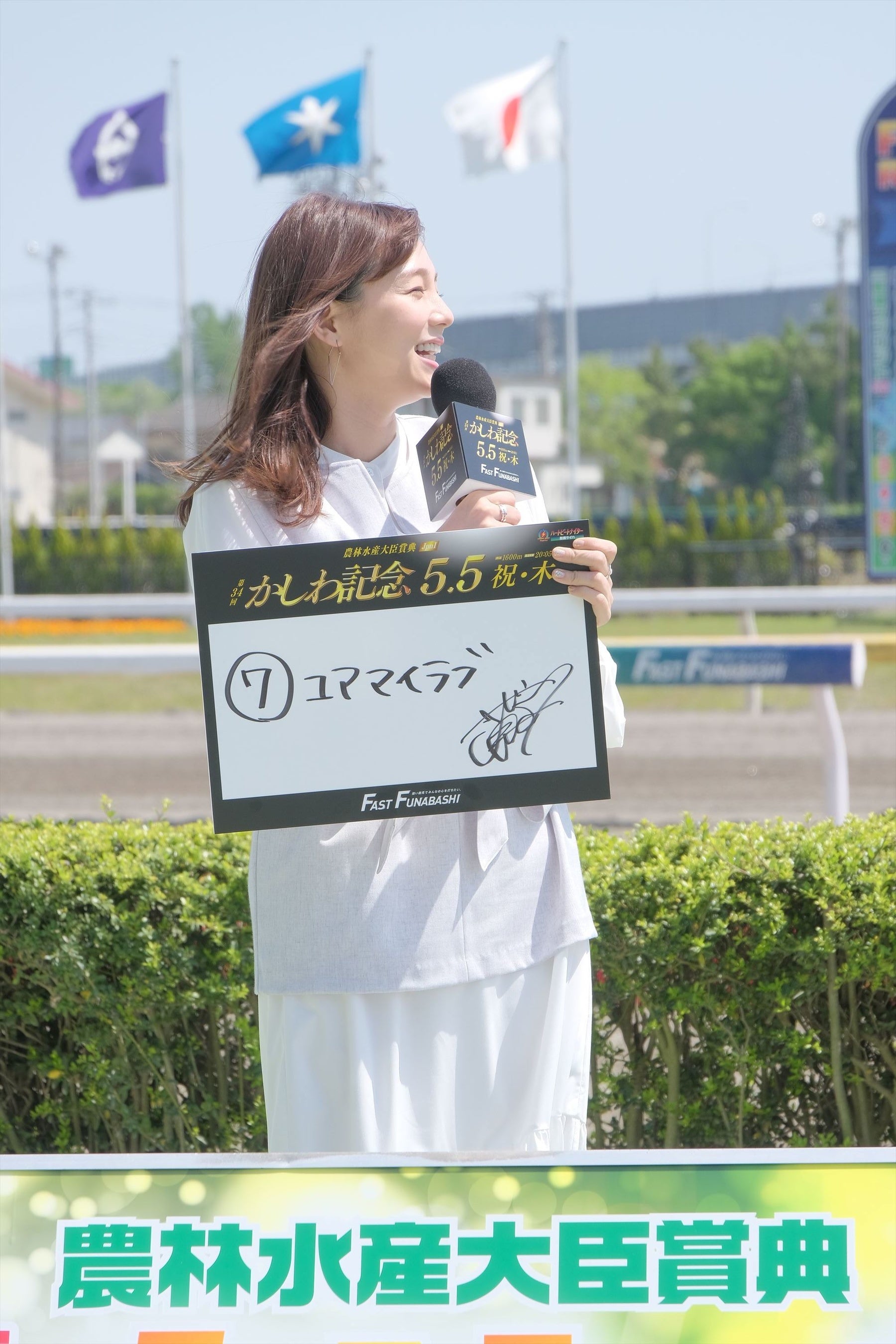 イベントでは、万馬券を的中させたこともあるという篠崎さんと競走馬「オマタセシマシタ 号」を購入した斉藤さんが『かしわ記念』の本命馬を発表。篠崎さんは自身の名前でもある“愛(ラブ)”が馬名に入っているという理由から『ユアマイラブ』、斉藤さんは前走の1,600mレースでの粘りを見て『テイエムサウスダン』を予想として発表しました。