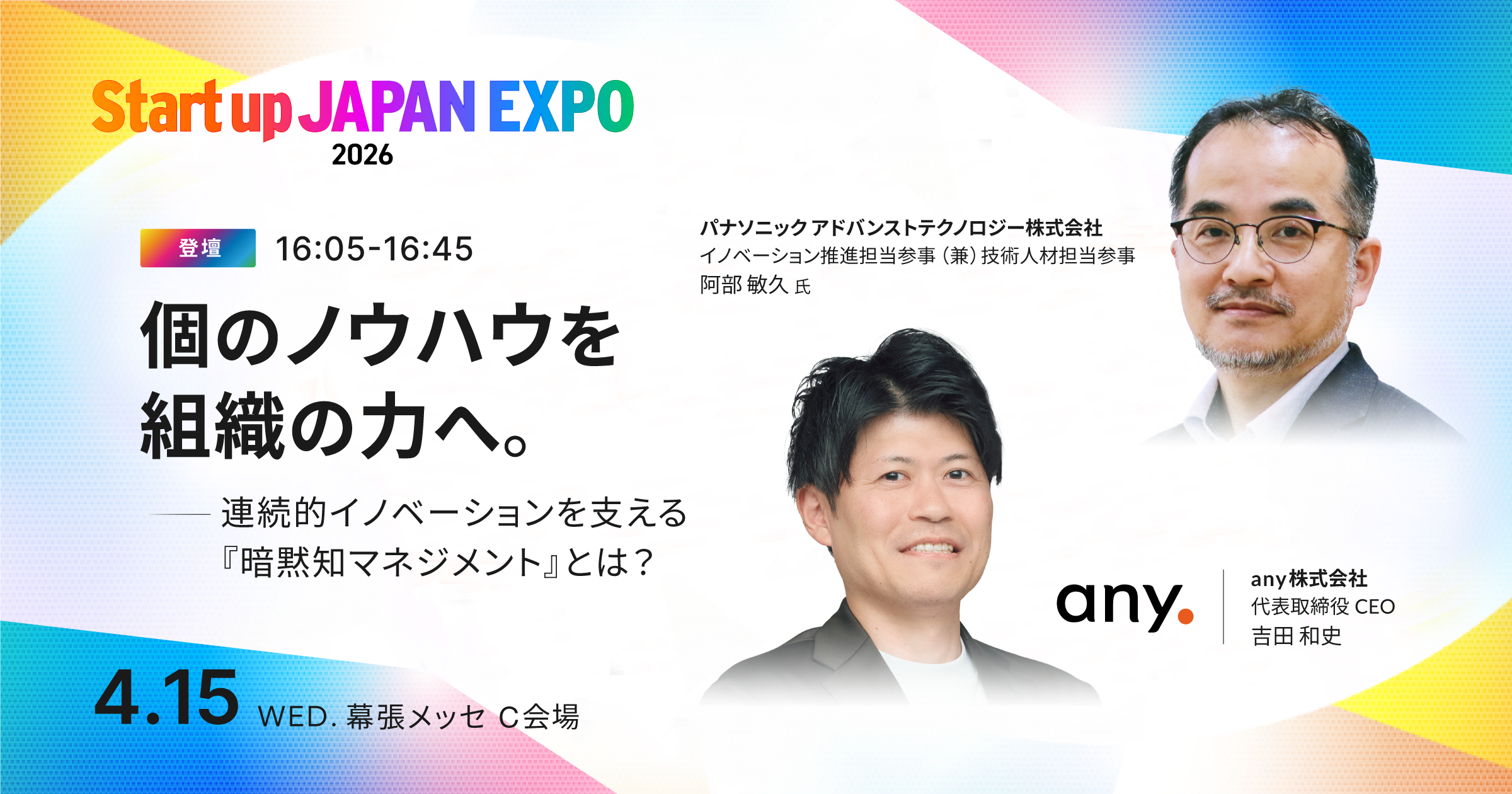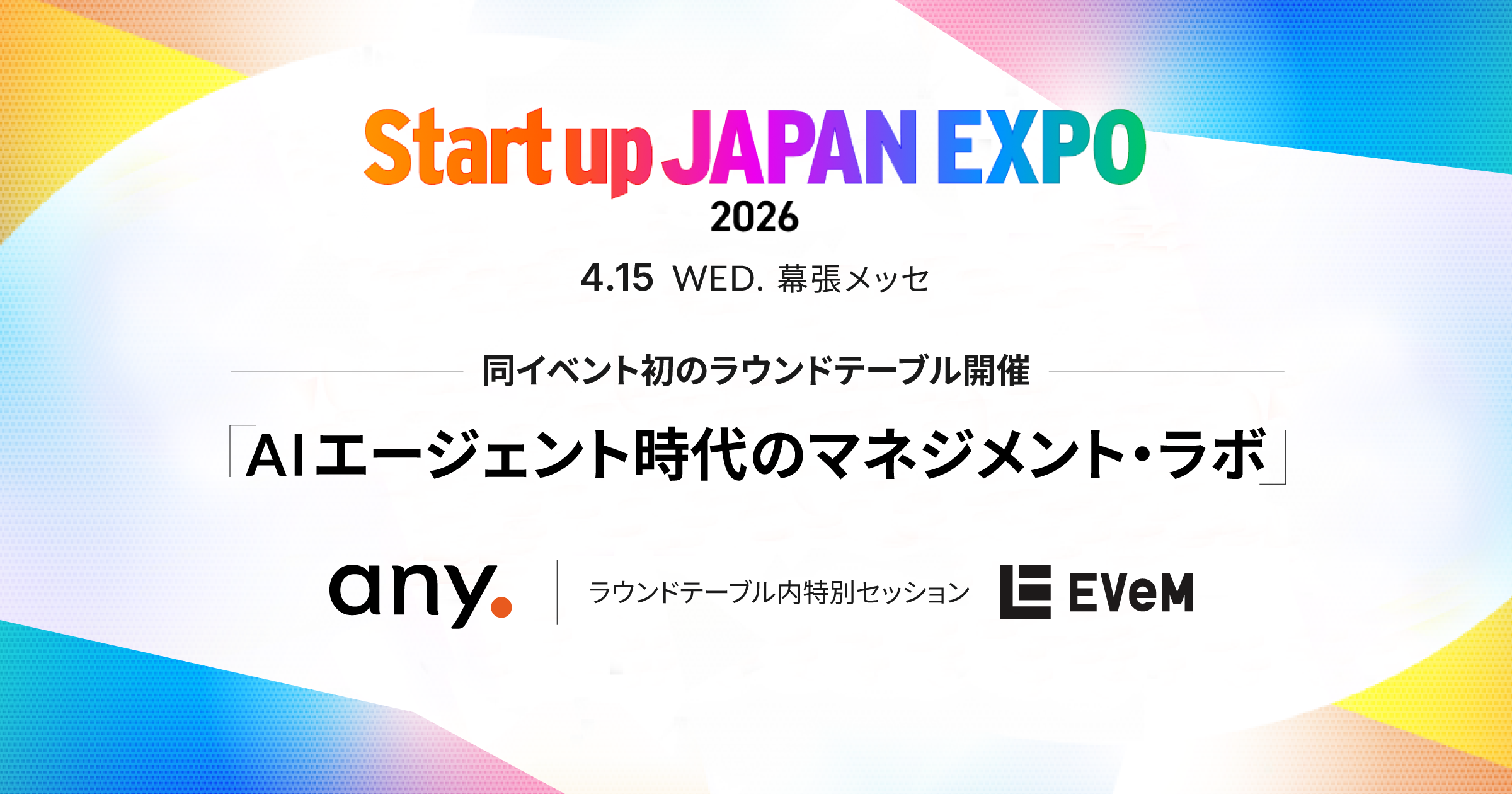 any株式会社(所在地:東京都千代田区、代表取締役CEO:吉田和史、以下:any)は、2026年4月15日(水)、16日(木)に開催されるEight(Sansan株式会社)主催の「Startup JAPAN EXPO 2026」にて、Startup JAPANとの共同企画による初のラウンドテーブルを開催します。