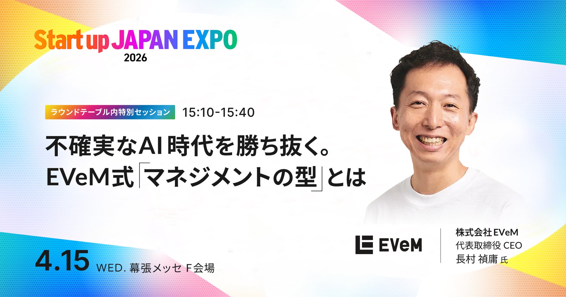 「Startup JAPAN EXPO 2026」にて、共同企画のラウンドテーブルを初開催。EVeM CEO長村氏を迎えた特別セッションで、AIエージェント時代のマネジメントを議論