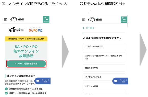 「SA・PO・PO無料オンライン故障診断」は、お車の故障や不調の症状をもとに、いくつかの簡単な質問に回答いただくことで、故障や不調の原因および解決方法をご案内する無料サービス※です。車が動かないといった場面はもちろん、最近少しエンジンがかかりにくい、異音がするといった不調の初期段階でご利用いただくことで大きな故障につながることを防止できます。また、整備士への有人チャットによる相談も可能であり、お客さまの自己解決をサポートします。