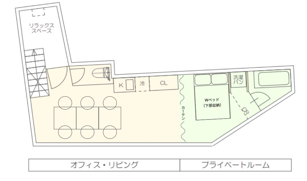 本物件の2階は、可動式家具を動かしたり、カーテンで空間を仕切ったりすることで、間取りを調節することで、さまざまな暮らしのシーンに最適な空間を実現できます。それぞれのワークライフバランスや利用人数、ミーティングや作業などの仕事内容に合わせてフレキシブルに空間を転換できます。