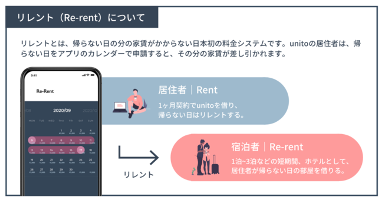 本物件は、帰らなかった日数に応じて家賃が減額される新しい家賃システム「リレント」を採用しています。入居者が、帰らない日の部屋をさらにホテルとして短期宿泊客に貸し出す(Re-Rent)ことで、家を使ってない日の家賃を節約することができます。