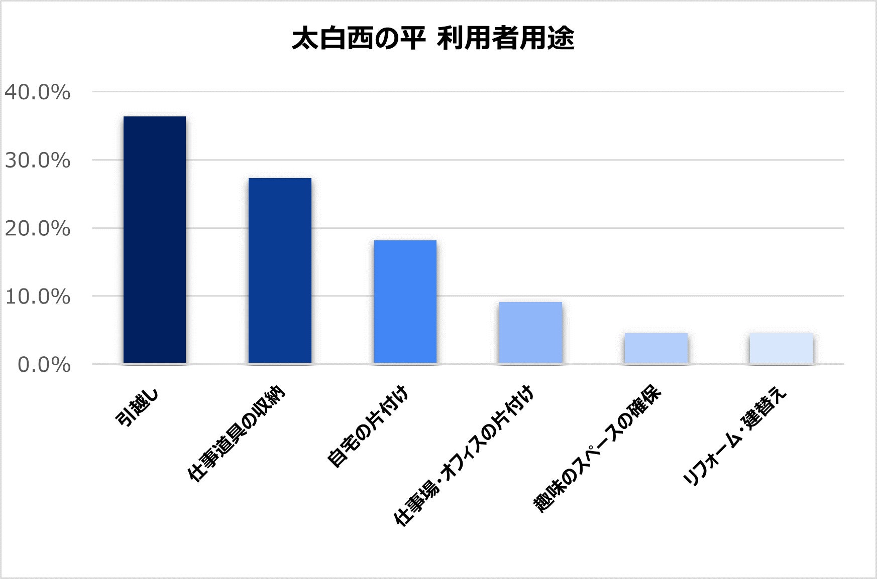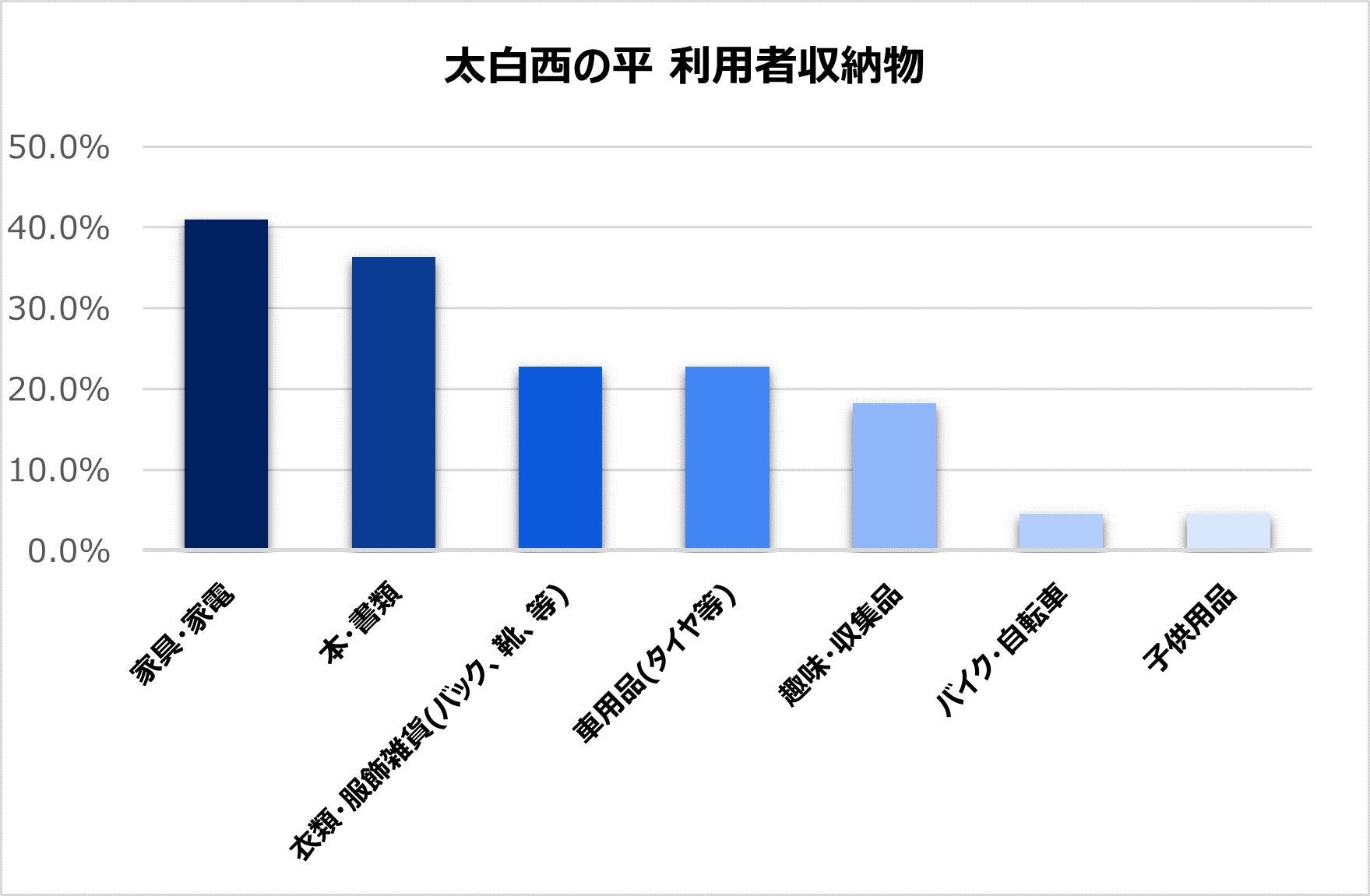 「太白西の平」物件の利用用途では、引越しでの利用が3割を超えており、一時収納場所として、置き場所をとる大きい家具、家電などの収納物の割合が多い傾向があります。他にも書籍や衣服など、お客様の用途によってさまざまな種類の荷物を収納いただいています。