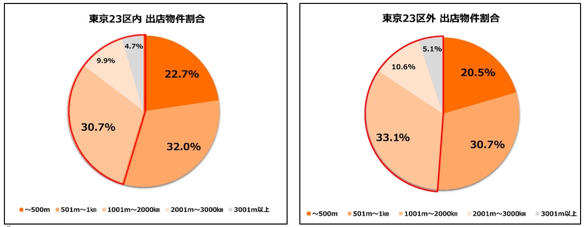 昨年度の東京23区内の新規出店割合では、駅から1km以上離れた場所での出店が全体の45.3%を占めており3km以上離れた場所にも出店を行っています。また、23区外でも全体の48.8%と半数近くの物件が駅から1km以上離れ、徒歩10~20分以上かかる位置にも、多くの物件を出店しています。稼働率でも駅からの距離に関わらず、80%以上を超えており、多くのお客様にご利用いただいています。