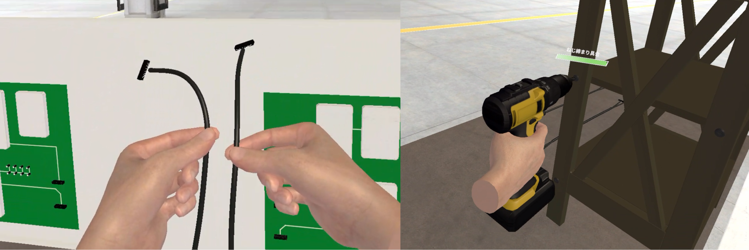 本システムは、ハーネスや電動ドライバーを使用したネジ締めなどの標準作業をバーチャル空間に再現し、設計段階での検証や、組立・保守工程の事前シミュレーションなどに幅広くご活用いただける仕組みです。