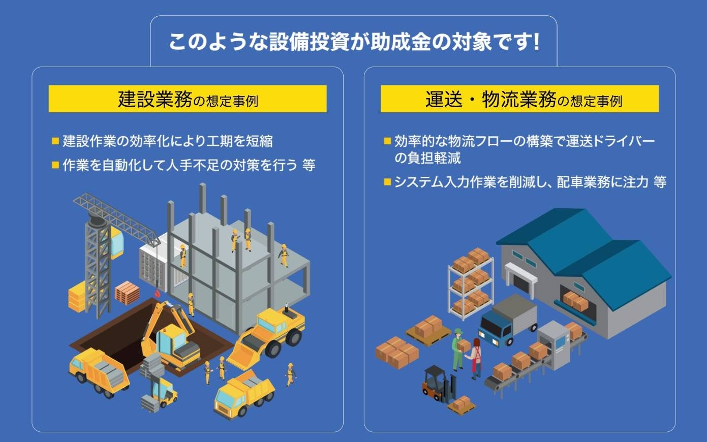 働き方改革関連法の時間外労働の上限規制が本年4月から運送・物流、建設業等にも適用されたことにより運送・物流、建設業界で人手不足の深刻化や売上の減少等、いわゆる『2024年問題』が懸念されています。この事業は、『2024年問題』への対策として生産性の向上や競争力強化のために必要となる機械設備の導入経費の一部を助成します。
