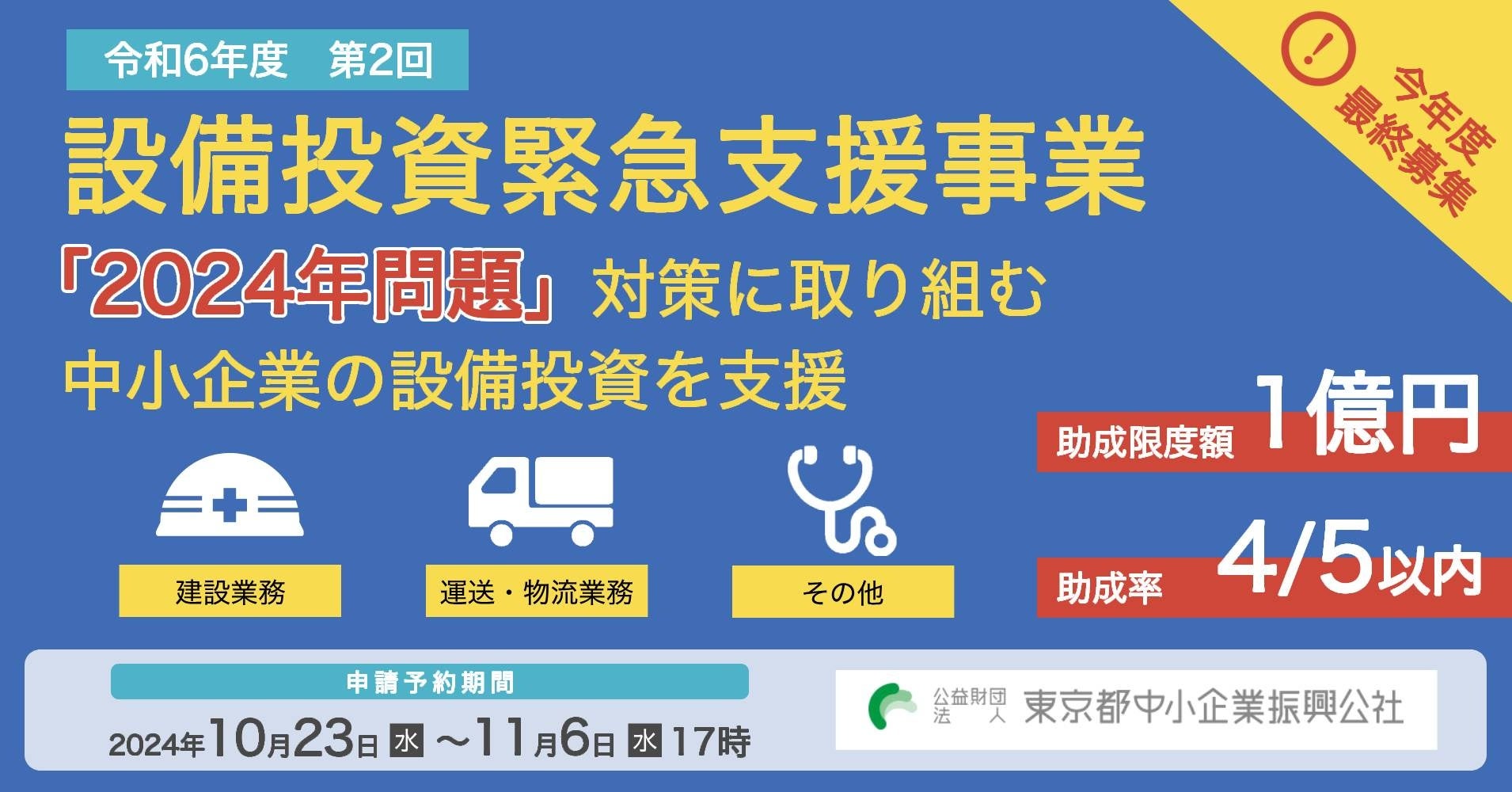 公益財団法人 東京都中小企業振興公社(本社:東京都千代田区、理事長:中西 充)では、「2024年問題」対策に取り組む中小企業が、機械設備の導入により生産性の向上や競争力強化を図ることを目的として「設備投資緊急支援事業」の申請予約を10月23日(水)から受け付けます。