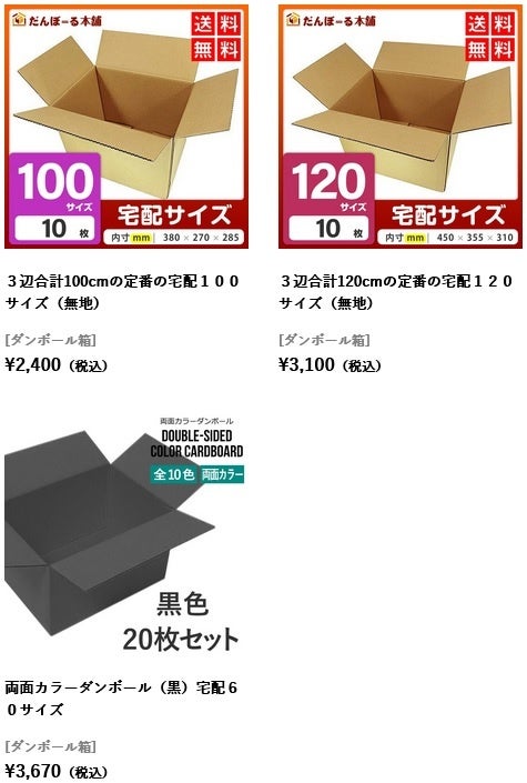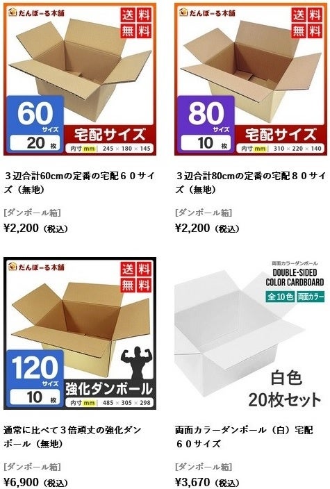 - ダンボール箱…定番ダンボール(全16種)、強化ダンボール(全14種)、カラーダンボール(全11種)、デザインダンボール(全6種) 、引越しセット、ワイン用ケース(全3種)