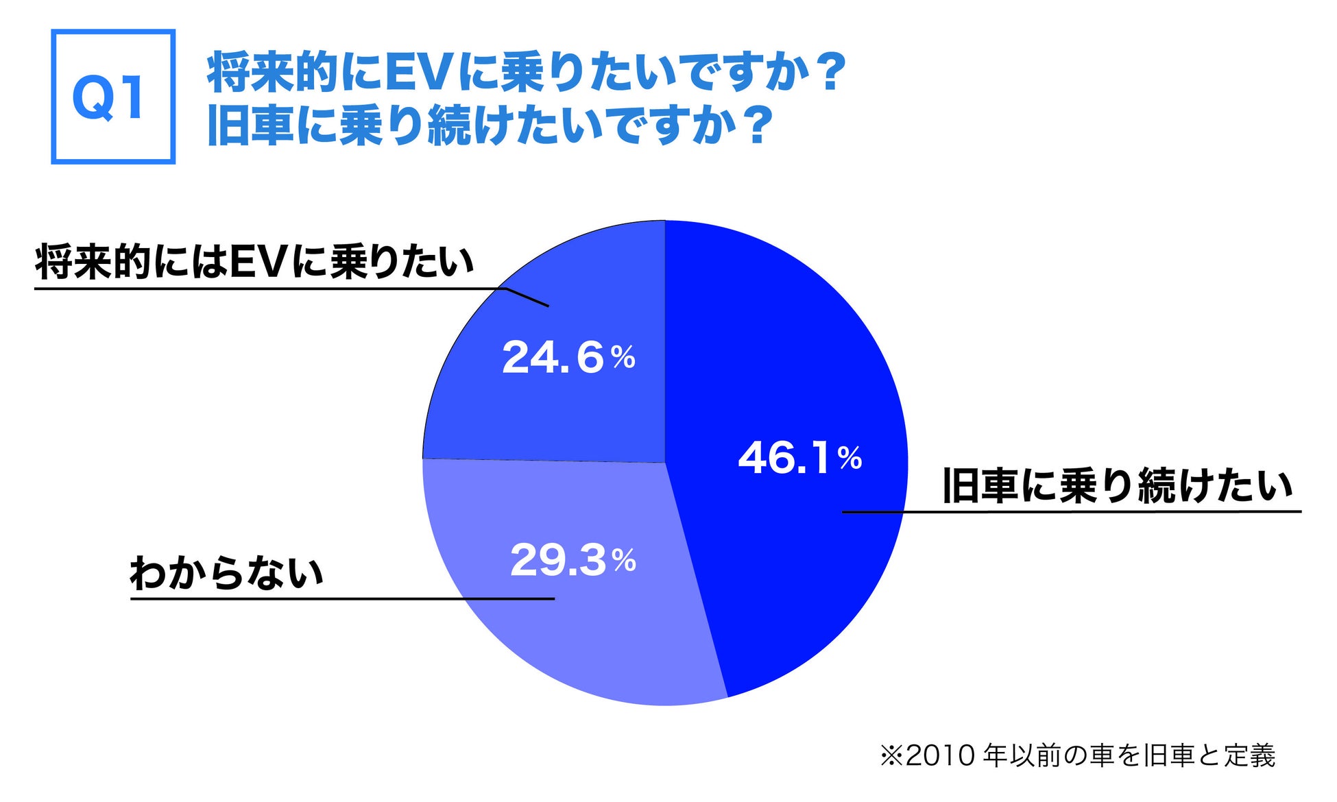 旧車好きの方に将来的にEVに乗りたいと思うかを聞いたところ、旧車に乗り続けたい 46.1%、わからない 29.3%、将来的にはEVに乗りたい 24.6%という結果になりました。