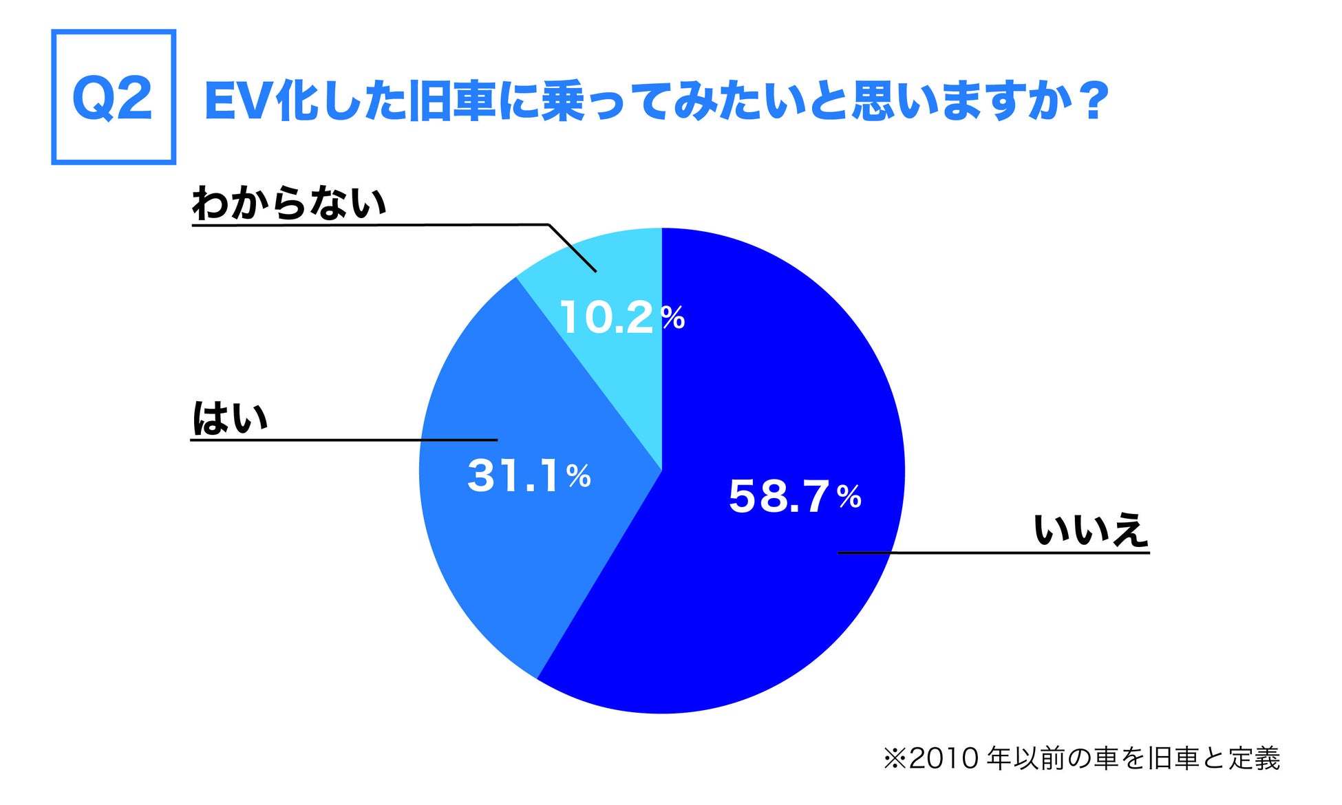 しかし、はいと答えた方も31.1%いることから、旧車をEV化したものに興味がある方も一定数いることがわかりました。旧車のEV化はまだ一般的でなく、費用もかかることからあまり広まっていませんが、今後EVの普及につれ選択肢が広まっていくかもしれません。