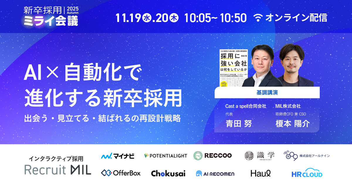 基調講演には、『採用に強い会社は何をしているのか』の著者であり、Cast a spell合同会社 代表の青田 努氏を迎え、MIL取締役CFO兼CSO 榎本 陽介との対談形式で「AI×自動化で進化する新卒採用 ― 出会う・見立てる・結ばれるの再設計戦略」をテーマに議論します。