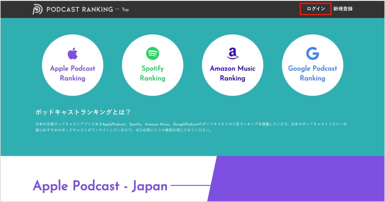 ①ポッドキャストランキング( https://podcastranking.jp/ )のTOPページ右上のログインをクリック