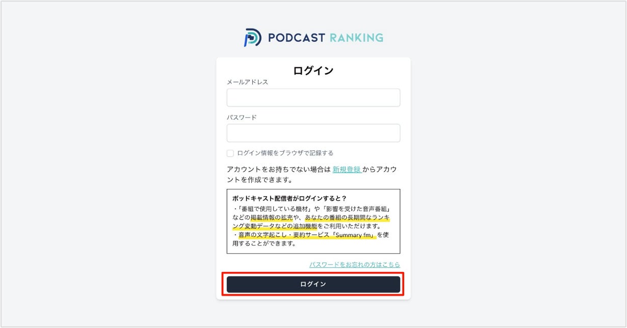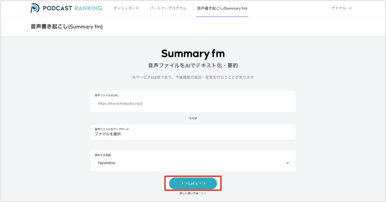 Summary fmは、オトナルが運営するウェブサイト「ポッドキャストランキング」のログイン後の管理画面からご使用いただけます。