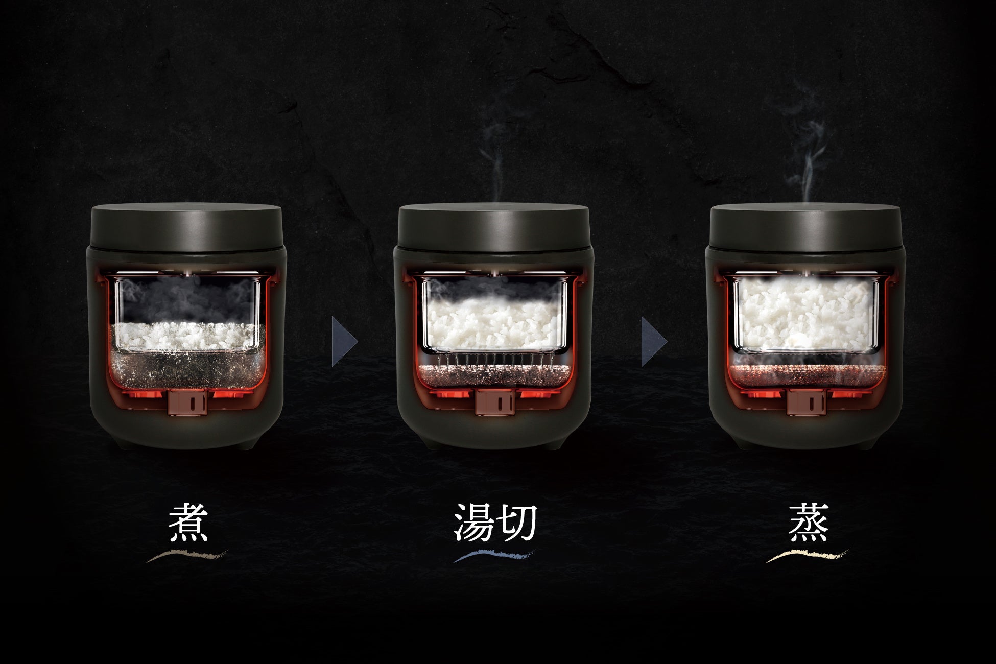 お米を煮ることで糖質を浮き上がらせ、お米から出た糖質がお湯に溶ける→糖質を含んだお湯が湯切りされ、お米から分離する→蒸気によりお米をふっくらと蒸し炊きにする。