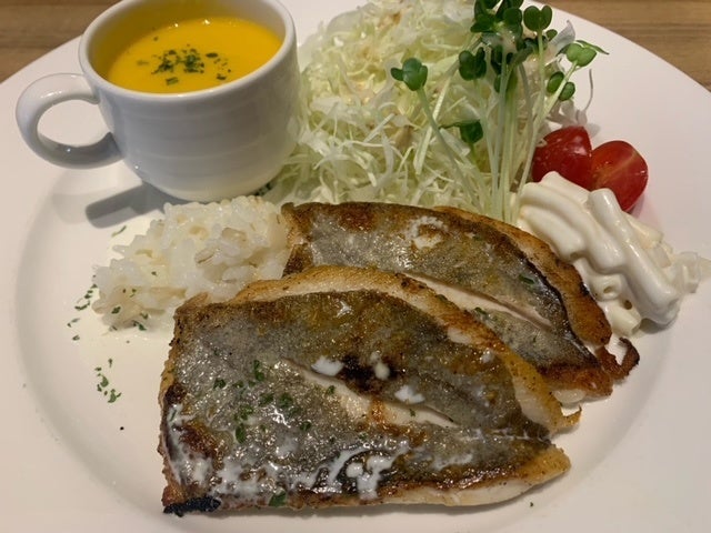 マトウダイを焼き上げた一皿にもち麦のリゾットを添えた一品。