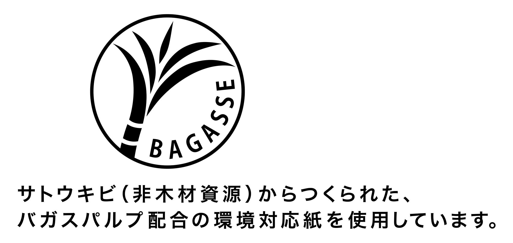 環境に配慮して、バガスパルプ配合紙を採用。バガスマークは、五條製紙(株)のバガス紙を使用した製品に記載できるマークです。