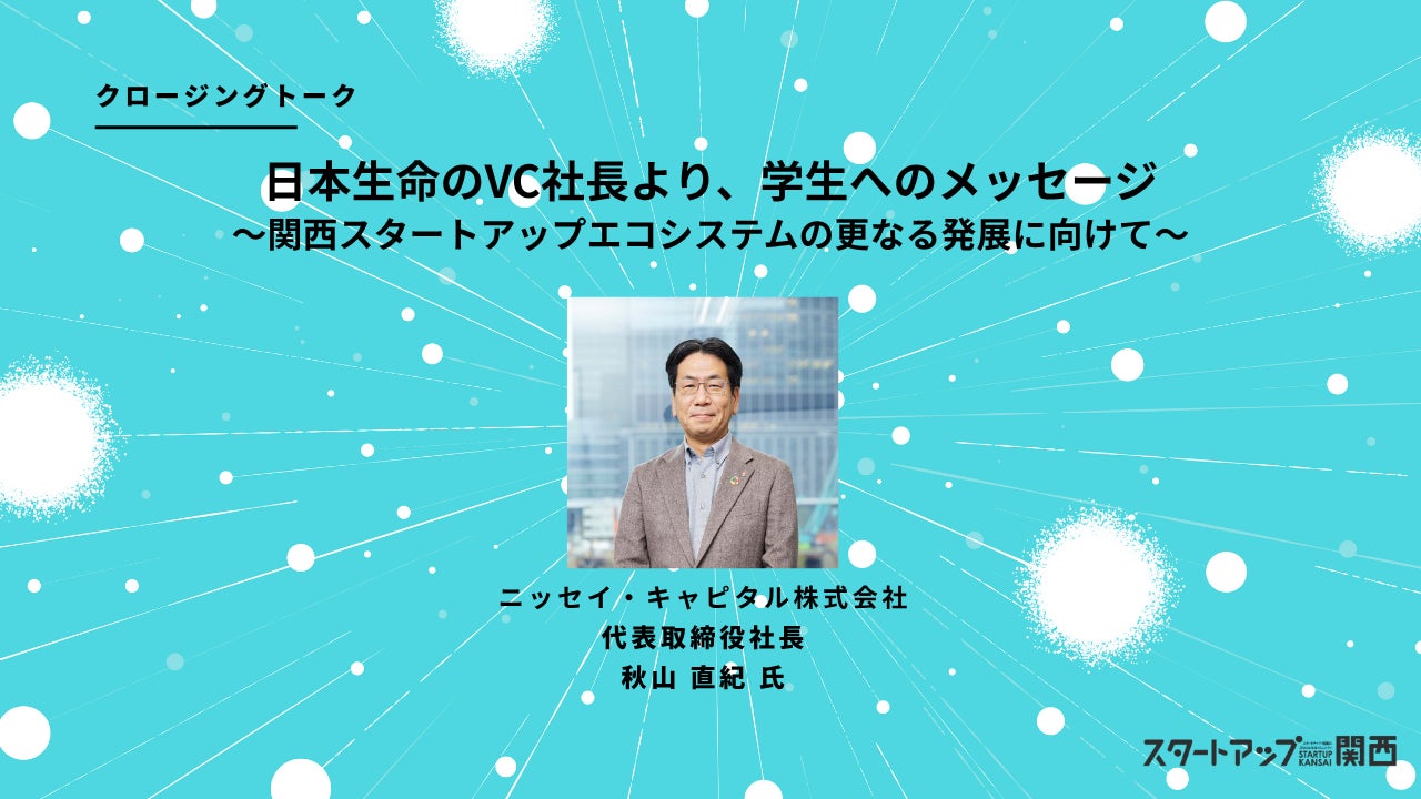 ニッセイ・キャピタルとTHE SEEDは関西エリアのスタートアップエコシステムの活性化に向けて、共にイベントを盛り上げてまいります。イベント内では、ニッセイ・キャピタル代表取締役社長の秋山氏とTHE SEED代表の廣澤によるクロージングトークが行われる予定です。