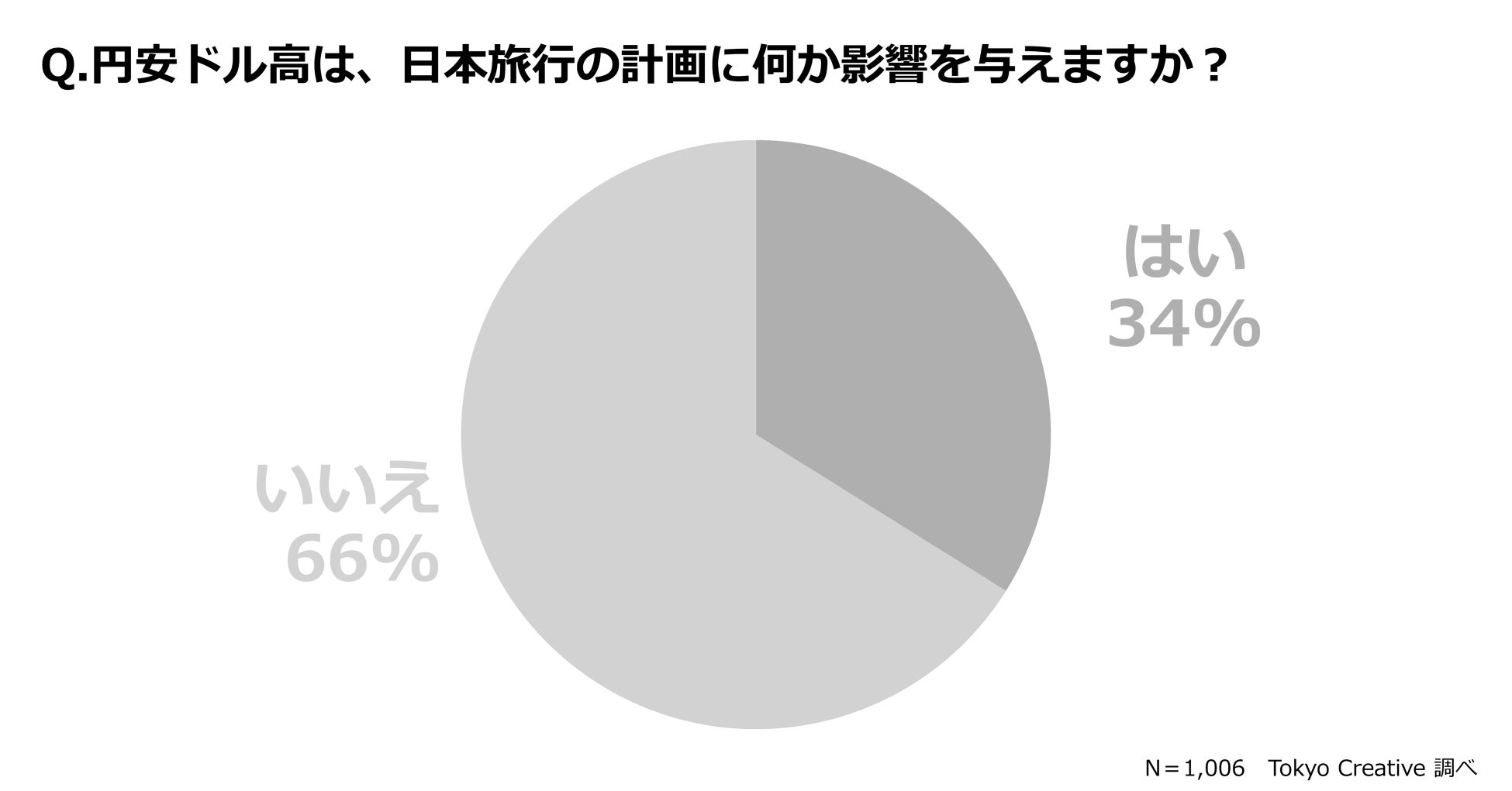 円安ドル高により、日本旅行の計画に何か影響があった人は全体の約3割にとどまり、66%は影響しないと回答しました。