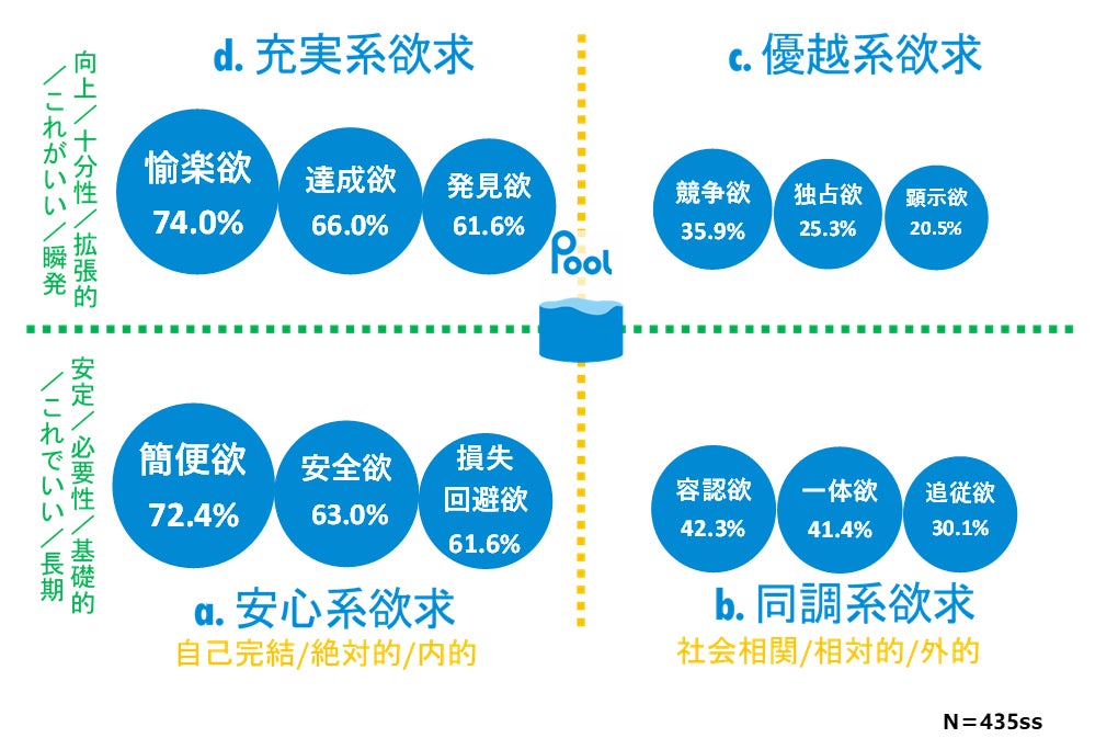 ※ PIX ループ™:博報堂行動デザイン研究所は、“いまどき”の生活者は“情報行動”と“消費行動”を明確に区別しておらず、『Pool (情報を引き寄せ貯めておく)』⇒『Ignite (気持ちに火が点く)』⇒『eXpand (体験をやってみて情報圏を拡げる)』という行動をループさせながら自己充足を図っていることを発見、次世代型行動デザインモデル「PIX ループ™」を開発しました。「12欲求」とは、4つの群に分けられた、a.安心系欲求(簡便欲・安全欲・損失回避欲)、b.同調系欲求(一体欲・追従欲・容認欲)、c.優越系欲求(独占欲・競争欲・顕示欲)、d.充実系欲(発見欲・達成欲・愉快欲)です。