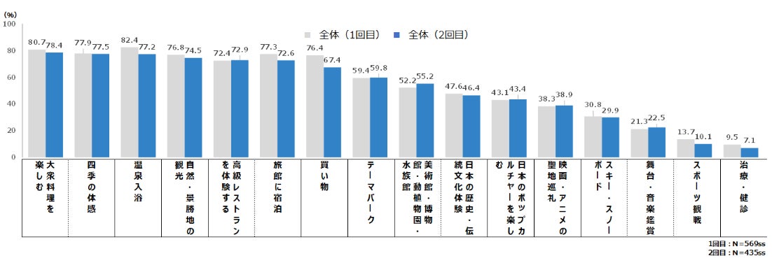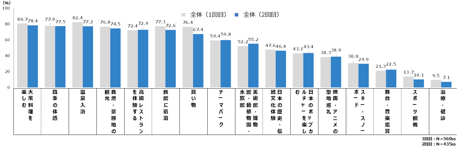 ●訪日目的は、「買い物」よりも「大衆料理を楽しむ」「四季の体感」「温泉入浴」などの“体験重視”を求める傾向に