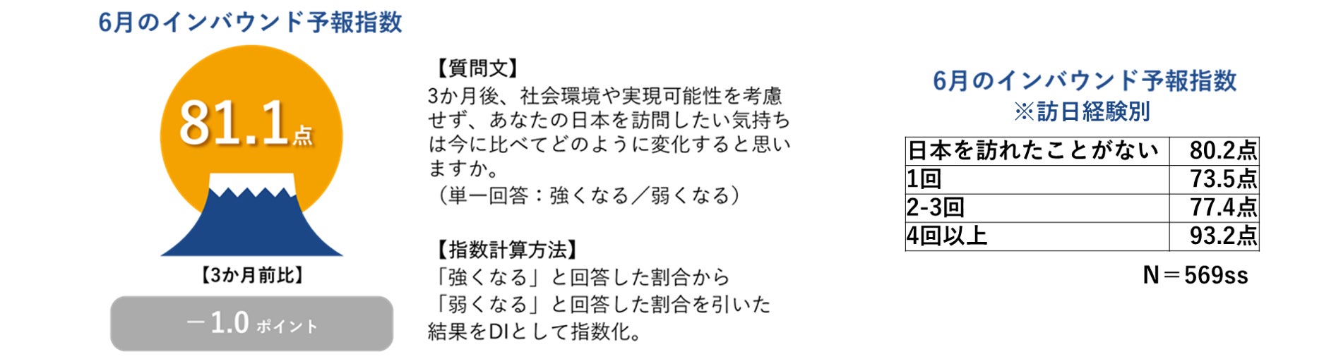 ●6月のインバウンド予報指数は、81.1点。訪日4回以上の層が牽引