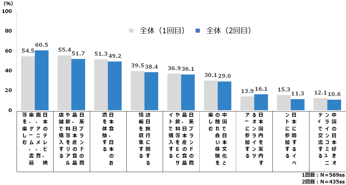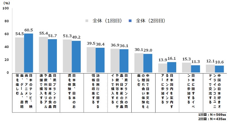 次の訪日前に中国国内で実施した日本に関連する活動を調査したところ、「日本のテレビ番組、映画、アニメ、音楽、ゲーム、書籍等を楽しむ60.5%」、「日系ブランドの商品、日本産の食品や飲料等をリアル店舗で購入する51.7%」、「日本食、日本の酒を体験する49.2%」、「訪日旅行に関する情報を収集する38.4%」、が訪日意欲の醸成に寄与していることがわかりました。